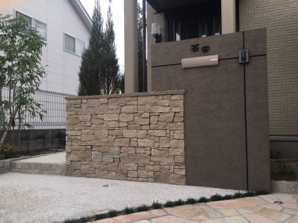 低い壁には自然石を張り存在感のある意匠壁です