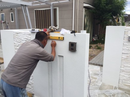 上郡町M様邸 表札取付け工事 2015年9月18日(FRI)昨日の雨もすっかりあがり今日はいい天気でした職人さんと表札・インターホンカバーの器具付けをしてきました 上郡町M様邸壁の吹付け作業も終わり残すは器具付けと植栽工事です 表札の位置を確認し印をして壁に穴をあけて取り付けていきます山中職人さんにカーポートの組立て工事の手を止めてもらい表札を取付けました明日の植栽工事で完成予定ですKajiwara