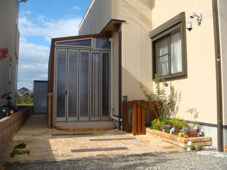 アプローチの耐火煉瓦も馴染みナチュラルな空間になりました