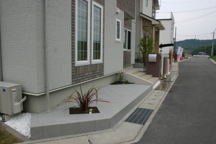 施工実績 ガラスパネルのモダンスタイル 姫路新築外構 ツートンスタイルのシンプルモダン外構。タイルのポイントを建物のカラーパターンをエクステリアウォールの色替えで表現したエクステリアデザイン。ガラスのオリジナルプレートに映るシンボルツリーのグリーンがワンポイントです。 交互にデザインした変化のあるエクステリアウォールデザイン。 タイルのローデッキスペース。銅葉のニューサイランをセレクトしました。 ガラスプレートを使用した個性的なエクステリア門周りです。