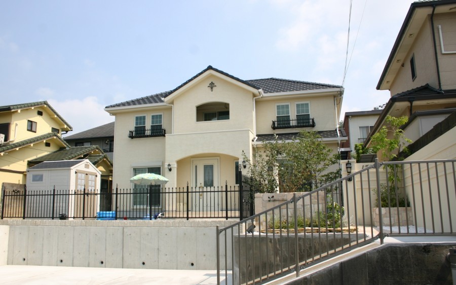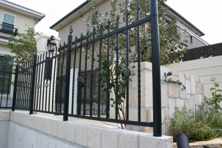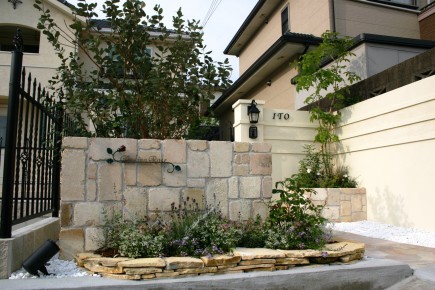 施工実績 姫路市新築外構 エレガントなフロントガーデン空間 建物が持つ可愛くエレガントな雰囲気を門周りにも取り入れてプランしました 高台の為、転落防止のフェンスは目隠し要素よりも建物を隠さない鋳物フェンスを使用しました 門扉とフェンスのデザインを合わせ、重厚感よりも可愛さを表現しています アイストップ効果のある異形耐火レンガの門柱は、その色目・目地の仕上げにより来客の目を引きます 要所に設けた植栽・花壇の緑と組み合わせることで淡い色目との調和が美しくなります . 異形耐火レンガの門柱 リラクゼーションサロンをされるショップサインを取り付けています 欧風の香り漂う門周り 仕切りにはYKK:トラディシオンフェンス 柔らかなピンク系の自然石乱張りアプローチ