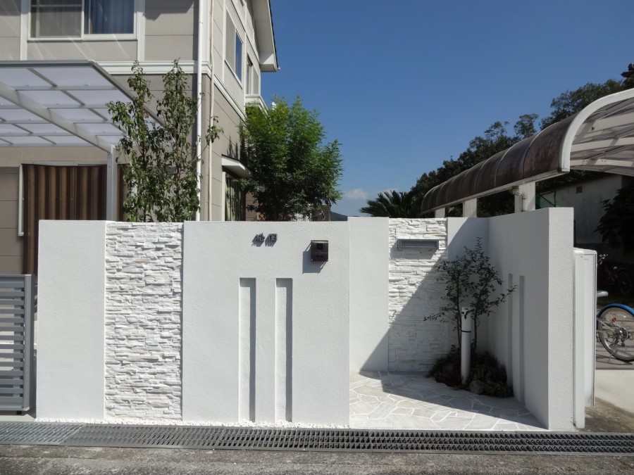 施工実績 上郡町リフォーム外構 白で統一されたシンプルで上品な門回り 車庫の拡張のご依頼を受けました上郡町M様邸現地でお話を伺っていますと門周りと合わせてリフォームをご希望されていました何度かのプラン変更を経て白を基調とした門周りへとリフォームさせていただきました全体は白ベースですが素材やテクスチャーの違いでおしゃれな門周りになりました 白に余計な色目を合わせたくなかったのでインターホンにもステンレスのカバーを取り付けていますニッチ加工も仕上げを吹きつけにすることで存在感があります アプローチの先は車庫との仕切りでシルバー色の角柱を使用しましたアプローチ自然石も白目地で仕上げることで色むらを活かす事ができています オーバードア・カーポートもシルバー色でシンプルで白の門周りとも調和しています