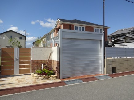 施工実績 姫路市新築外構 建物と統一感のある門回り|レンガタイル張り 道路・隣地からの視線を遮り プライベートなお庭空間をご希望されていました姫路市Y様総レンガタイル張りの建物の上品さ重厚感を門周りの方にも取り入れましたクローズスタイルでアルミ材(金物)が多くなってしまいますが、色目を押さえ石材やレンガを使用することでバランス良いエクステリアが完成しました 高さがある門扉/門袖壁ですが腰部分に建物とリンクするレンガタイルを張っていますので重厚感のある仕上がりとなっています 車庫前には目隠し効果のあるシャッターゲート高さがある分 隣接する門袖壁とのバランスが難しいのですが門袖壁をセットバックさせ植栽スペースを設けることでバランスをとっています