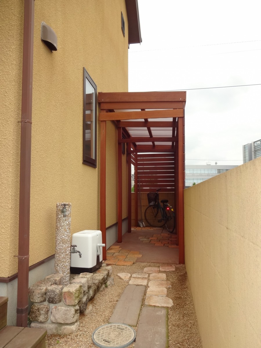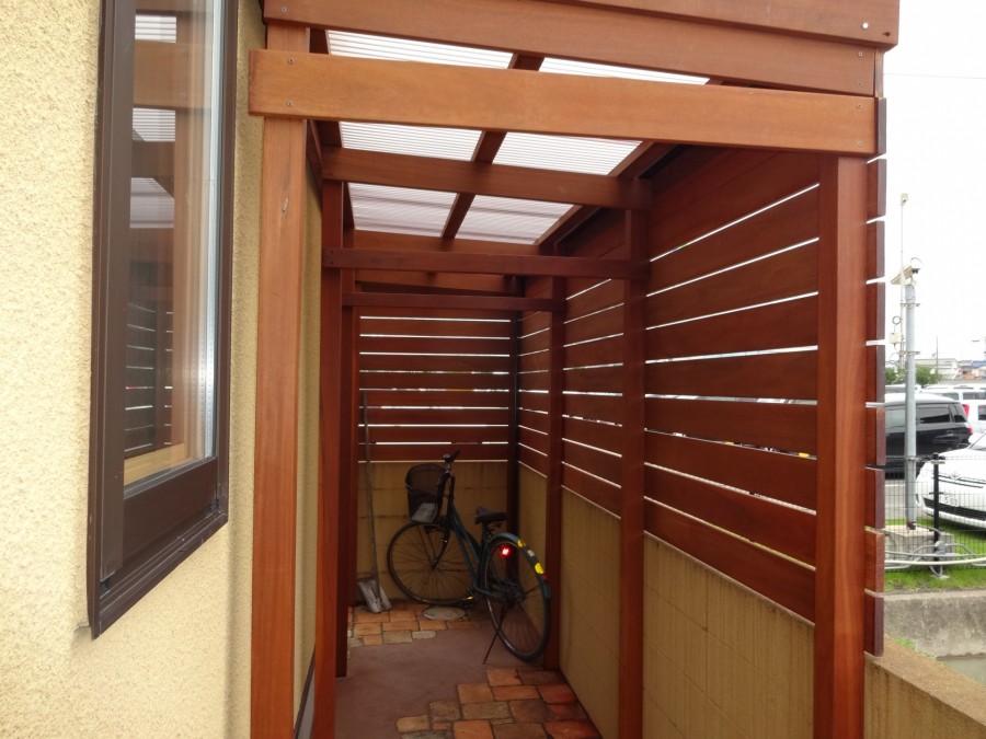 施工実績 温かみのある木製自転車置き場 加古川市T様邸 当社ホームページをご覧いただき ナチュラルな自転車置き場のご依頼を頂きました加古川市T様邸ハードウッド:ウリン材を使用しおしゃれで実用的な自転車置き場が完成しました横張りで近隣からの視線も遮断できると同時に横降りの雨も軽減できます明るさを取り込むのにマット調の波板ポリカ材を使用しています既存の煉瓦も土間に敷きいい雰囲気になりました before1 イメージパース 建物には直接取り付けず 独立で設置しています屋根回りの幕板も厚みを変えてどっしりとした重厚感を持たせています before2 外からの雨も軽減してくれる横張り板 before3 before4 既存のベンチ前に耐火煉瓦とカラークリートでテラススペースを既存のアプローチとも繋げてサイクルポートへと小道は続いていきます