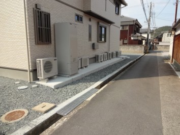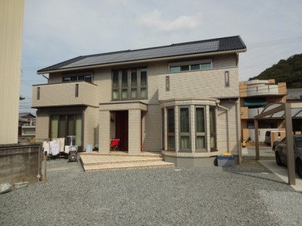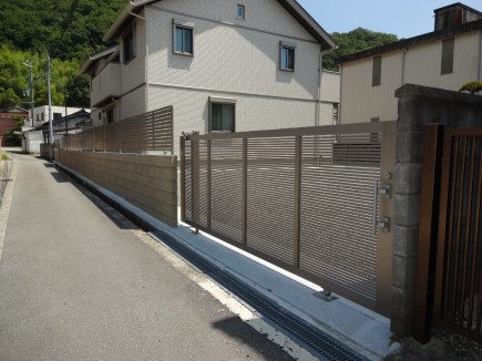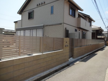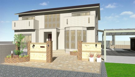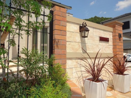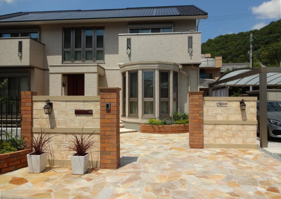 施工実績 姫路市新築外構 自然石張り踊り場 おしゃれで上品な門回り 建物の豪華さに見合う門回りをご希望されていました姫路市A様モデルハウスを意識したおしゃれで上品な門回りをご提案させていただきました煉瓦門柱やタイル張りの門袖壁でファサードを飾り、アプローチには自然石乱張りで豪華なイメージで仕上げました要所にも植栽スペースを設け建物と統一感のある門回りとなりました before 完成イメージパース 前後に設けた2枚の門袖壁は奥行きを感じさせてくれますベージュのタイルにオレンジ系の煉瓦を合わせることで明るい雰囲気となります before1 after1勝手口側は道路からの目隠しも考慮し少し高めの門扉・フェンスで閉じています before2 after2サブの車庫スペースの出入り口として間口4.0mの引き戸を採用しました