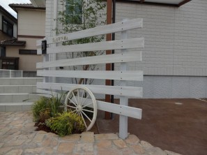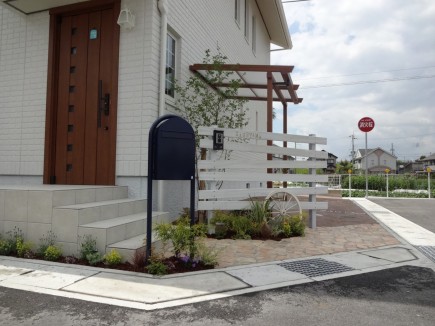 施工実績 姫路市新築外構 大人可愛いナチュラルな門周り 白い外壁に茶色の玄関扉/窓飾りのアイアンのフラワーボックスが印象的な姫路市K様邸外構デザインにもあまり色目は使わずに白・茶にアクセントになる青のポストを設けました門柱には白塗装したハードウッドをラフに横張りし、板の隙間からも後ろのエゴノキが見え隠れします木目調のサイクルポートも門周りの一部として調和しています before 計画図 アプローチには淡いベージュの異形の耐火煉瓦敷き目地は骨材を多く入れたアイボリー色にすることでよりナチュラルな雰囲気になります足元の植栽スペースの緑も良く映えます アクセントカラーの青のボビポスト白が背景だと上品な感じがします 木目調アルミ材 パーゴラ調のサイクルポート耐火煉瓦を敷き伸ばし同じ空間として馴染んでいます お客様の声 ▼ご感想・お気付きの点をお聞かせ下さい とても感動しました。 ありがとうございました