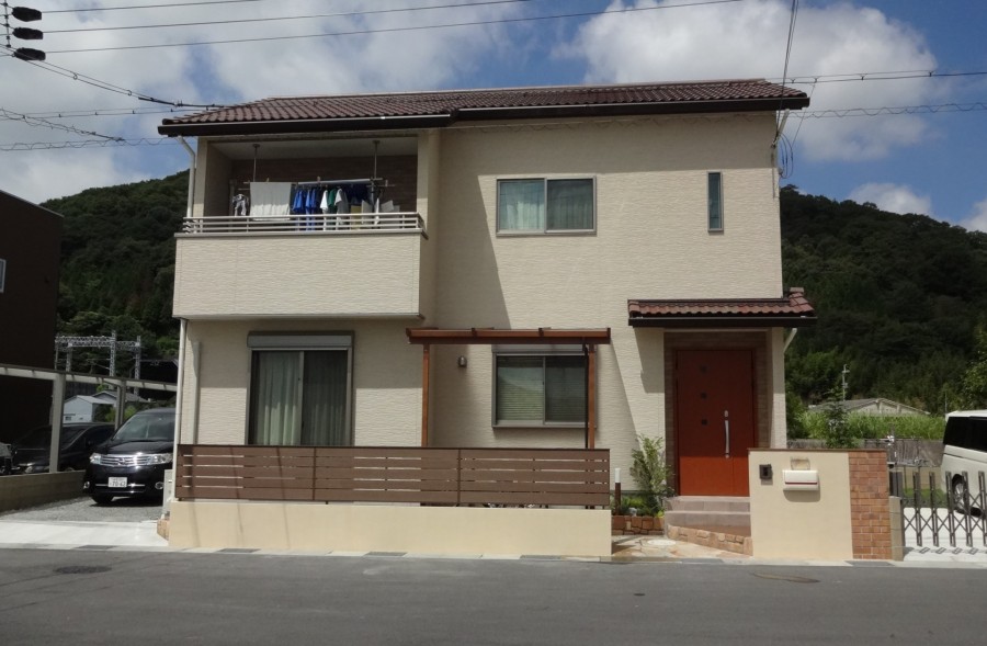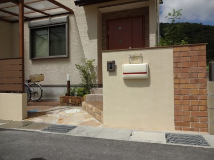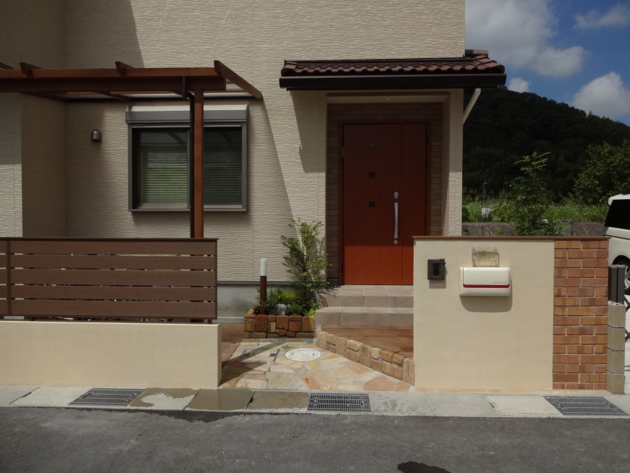 施工実績 太子町新築外構 建物と調和したナチュラルデザイン ベージュ系の外壁や玄関扉の木目調を門周りにも取り入れたデザインとなりました太子町I様邸門袖壁と塀でセミクローズ仕様となっていますナチュラルな雰囲気に合うディーズガーデンポスト/表札などのアイテムを取り入れています塀の後ろに設けたサイクルスペースへの導線も確保した使い勝手の良い門周りとなっています before イメージ図 門袖壁と塀との間より玄関へのアプローチとなります道路との高低差を解消するため可愛い耐火煉瓦でステップを設けています開口部分より見える土間には自然石乱張りで豪華さも兼ね備えています 塗り壁とレンガタイル張りの門柱ディーズガーデン:表札・ポスト・インターホンカバー 門袖壁と合わせた塗り壁の上にはFRP製の木目調アルファウッドフェンス
