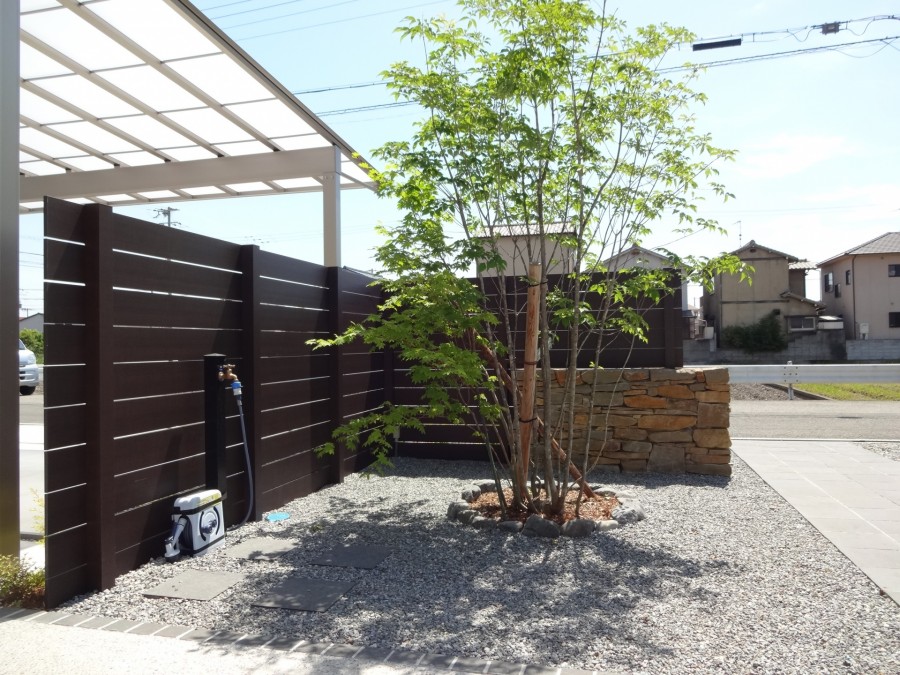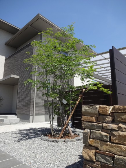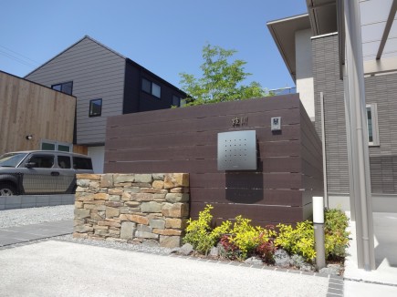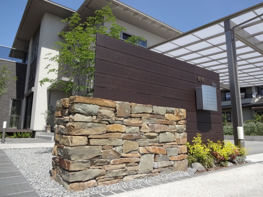施工実績 姫路市新築外構 アルデンヌウォーリングで重厚感のある門回り エッジラインが美しい姫路市E様邸建物のボリュームに負けない存在感のあるアルデンヌウォーリング積みの門柱建物の特徴を門柱にもリンクするように角の石使いには気を配りました自然石コバ積み特有の深みのある色合いがナチュラル感を醸し出してくれます植栽との相性も良く建物に合った落ち着いた雰囲気のお庭が完成しました 木目調の板材を隙間を小さくして取付けることで板塀としての趣があります シンボルツリーにはアオダモを選びました アルデンヌウォーリングを空積み仕様で積み上げ石の持つ豪華さや上質な感じが家の顔となっています