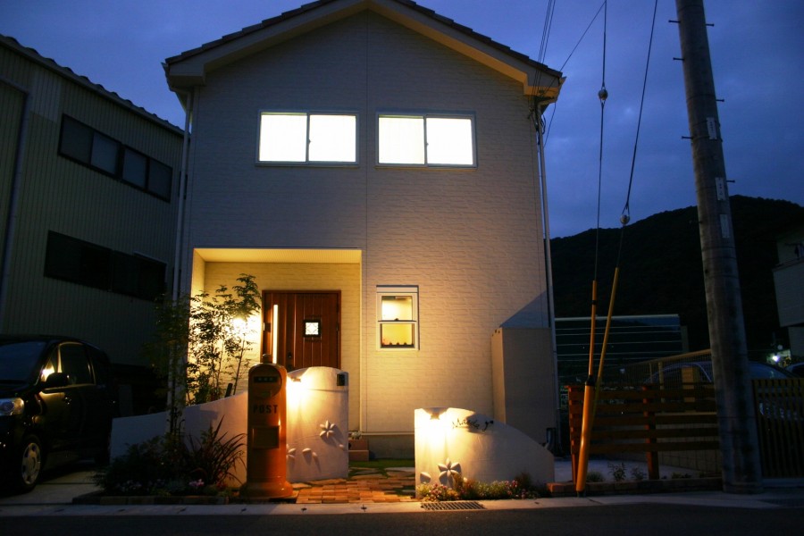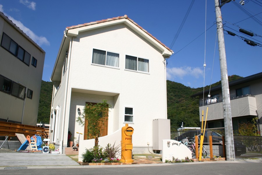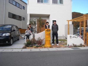 施工実績 DIY|ご家族と共にお庭づくり 姫路市M様邸 DIYが得意な姫路市M様邸。 既設の黄色い「Theポスト」をワンポイントに取り入れ、曲線の門柱で高低差を生かしたデザインに設計しました。 アプローチもラフなイメージでレンガと自然石で仕上げています。 ホワイトウォールの前に銅葉のニューサイランと小花達が門周りを明るく彩ってくれます。 アプローチはビンテージレンガとコッツランドストーンの厚みのある自然石でナチュラルに仕上げました。 車庫のコンクリートは角を落とし丸みを付けています 門柱のワンポイントにさり気なくフラワータイルを貼り付けました。