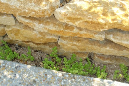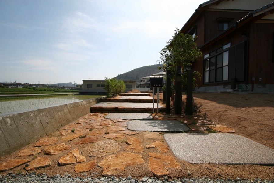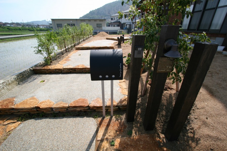 施工実績 開放感のある枕木風門柱 高砂市S様邸 敷地の広さ及び建物のボリューム感に合わせてアプローチのステップも大きく設けました。 ライムストーン(天然石)をコバ積みにし目地にはセダムを植え込み石とグリーンとの調和を図りました。 門柱としての塀を作らずラフにコンクリート製枕木の角柱で門柱としての役目を果たしています。 ゆったりと上る自然石コバ積み階段 ステップ際にセダムを植え込みました 熱中症対策です(笑)
