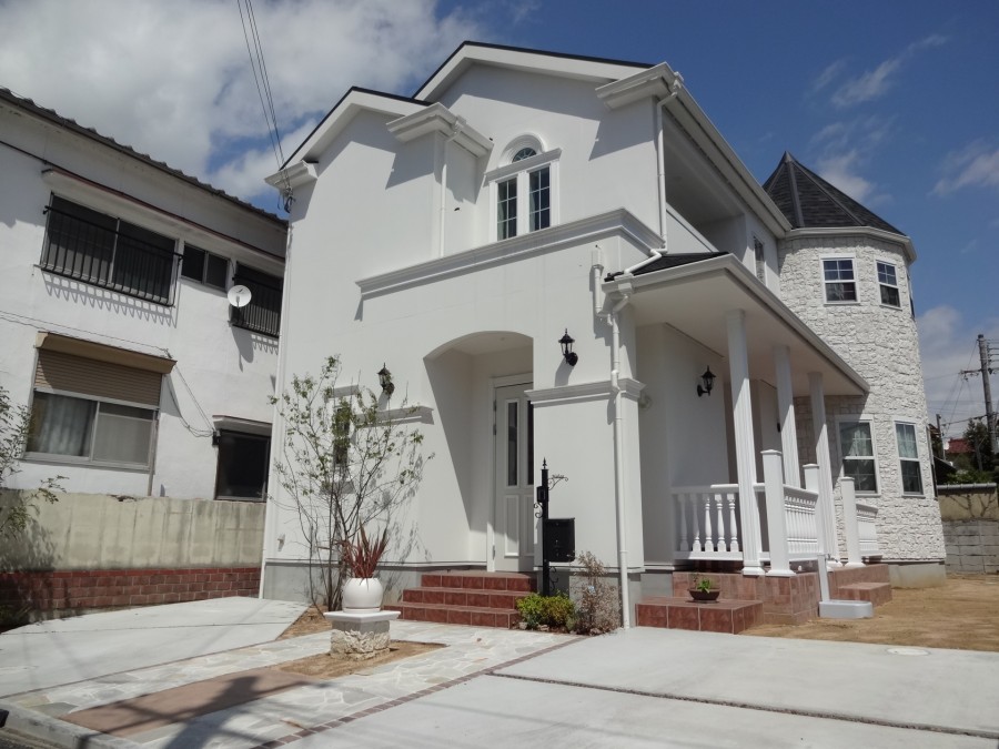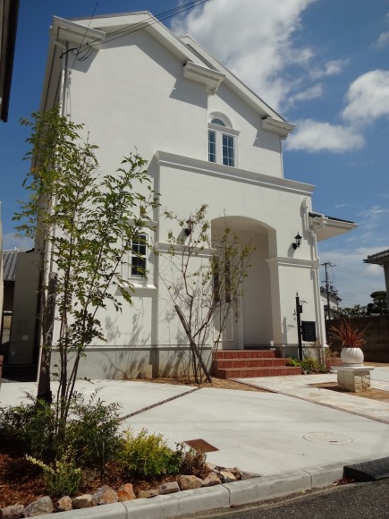 施工実績 姫路市新築外構 ピンコロで縁取られた白の自然石アプローチ 真っ白な外観に尖がり屋根が印象的な姫路市N様邸外構にも白を取り入れたエレガントなイメージをご希望されていました前面道路幅が狭いこともあり、1台分は斜め駐車でご提案させていただきました玄関前のピンコロで縁取られた白の自然石アプローチもシンメトリーなデザインで建物とリンクさせています 斜め駐車をすることでうまれる角の三角地帯は植栽スペースとして見せることで敷地全体に幅を持たせます アプローチの自然石乱張りを白目地で仕上げることで石の色むらが際立ち豪華な印象を受けます