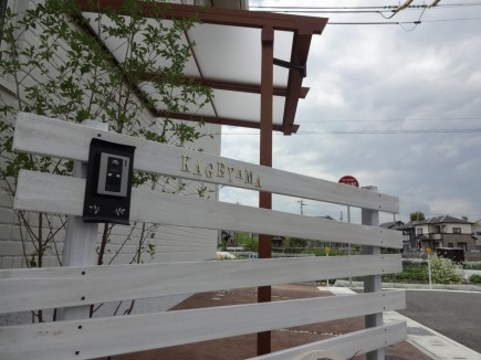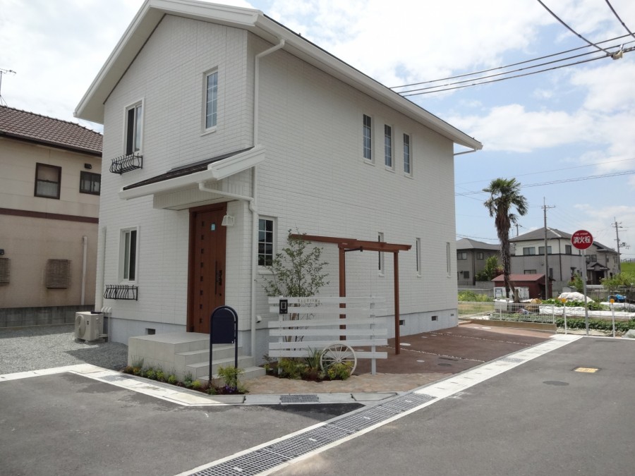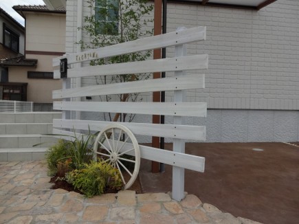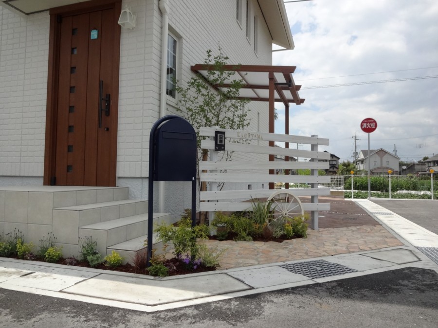 施工実績 姫路市新築外構 白塗装ウリンフェンスとボビポスト 白い外壁に茶色の玄関扉/窓飾りのアイアンのフラワーボックスが印象的な姫路市K様邸外構デザインにもあまり色目は使わずに白・茶にアクセントになる青のボビポストを設けました門柱には白塗装したハードウッドをラフに横張りし、板の隙間からも後ろのエゴノキが見え隠れします木目調のサイクルポートも門周りの一部として調和しています アプローチには淡いベージュの異形の耐火煉瓦敷き目地は骨材を多く入れたアイボリー色にすることでよりナチュラルな雰囲気になります足元の植栽スペースの緑も良く映えます 木目調アルミ材 パーゴラ調のサイクルポート
