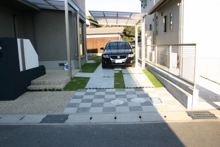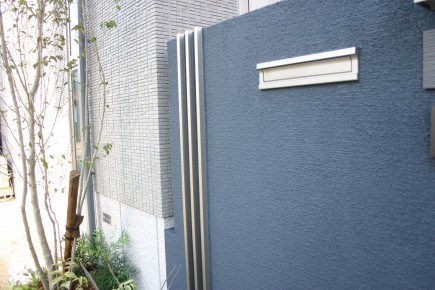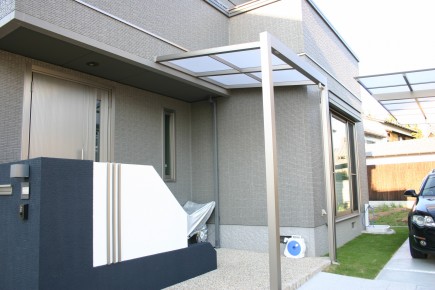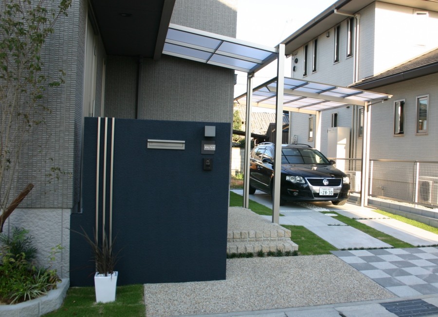 施工実績 ステンカラー|シンプルエクステリア 姫路市T様邸 元々ホワイトの門柱だった太子町T様邸。 玄関前の目隠しのご希望から少し門柱に手を加えました。 モノトーンに仕上がった門柱には、デザイナーズパーツのアルミスリットをデザイン。 存在感のある門周りに仕上がりました。 車庫周りもモノトーンにデザイン。 平板は透水性で芝生と組み合わせることにより、環境にやさしいデザインになりました。 玄関先には、デザイン性を重視しTOEX プラスGにて屋根を取付ました。 建物バルコと併用して玄関周りの使い勝手が一段とアップしました。 TOEXデザイナーズパーツを使用。 ブラックの壁にラインがスマートに納まりました。