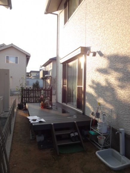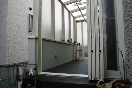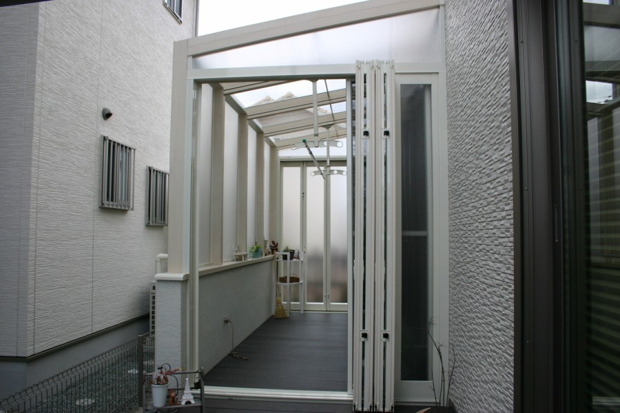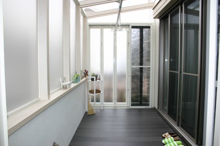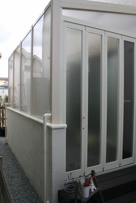 施工実績 白で統一された空間 ココマガーデンルーム たつの市A様邸 4年前に新築外構工事をお任せいただきました たつの市A様この度当初の計画にもありましたココマガーデンルームを設置させていただきました既存のデッキを一度解体、少しカットし予定通りうまくおさまることが出来ましたデッキのダークな色目と対照的に明るいイメージの白を基調としたココマガーデンルームで建物と統一感があります 一期工事で施工させていただきましたウッドデッキを利用してココマガーデンルーム腰壁タイプを設置させていただきます 腰壁部分は吹付けで上質な雰囲気を出すのにトラバーチン仕上げを施していますパネルをマット調にすることで隣地などからの目隠しになります 腰壁にリードを取付けワンちゃんと一緒にくつろげる空間となっています 腰壁上の笠木には小物を飾られてお部屋の延長としてお使いいただけます