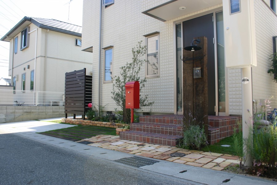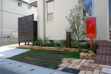 神戸市新築外構 赤いポストが映える緑いっぱいの庭