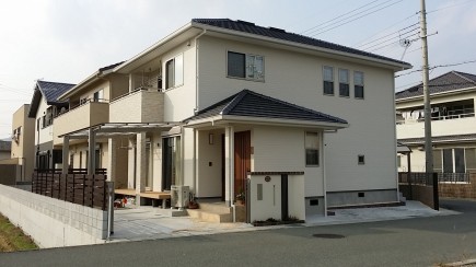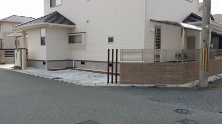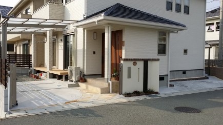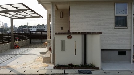 施工実績 赤穂市新築外構 ベーシックモダンスタイルデザイン ボリュームのあるベージュカラーの門柱にダークブラウンのレンガ笠置をデザインしました。ウッドの横桟フェンスでナチュラルなエクステリアに仕上げました。門柱前の季節の小花が明るく演出してくれます。 ウッドスリットバーを連続してデザインしました。細型スリット窓と縦型ポストのデザインにリンクしています 昼はオープンエクステリア夜は防犯を兼ねたクローズエクステリアに変わります違和感なくまとまりました。 ゆとりのあるバックヤード自転車置き場と併用した配置計画にしました。