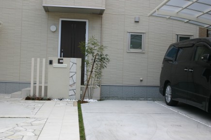 施工実績 太子町新築外構 ホワイト門柱のクールエクステリア ホワイトでまとめたクールなエクステリアプラン。全体的に明るい印象になりました グリーンのラインの延長上にシンボルのシマトネリコ自然石のホワイトもインパクトあります。 ホワイトカラーでまとめたエクステリアデザイン門柱玄関扉のプライバシーも考慮しているデザインです 大胆なR状のホワイト自然石のアプローチデザイングリーンのラインもワンポイントです。