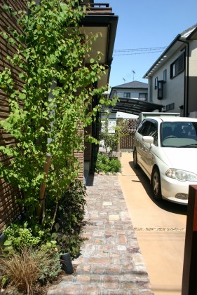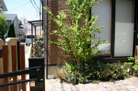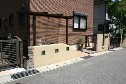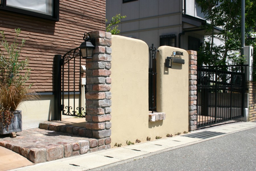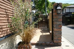 施工実績 太子町新築外構 耐火煉瓦でクラシックなクローズデザイン クローズ外構をご希望されました太子町M様邸耐火煉瓦をアクセントに アイアン風な門扉と組み合わせることで上質かつクラシカルな雰囲気を出していますクローズ仕様にすることで門袖壁が必要になってきますが煉瓦+アイアン 塗り壁で表情を付けることで単調さを解消しています before 平面・立面計画図 耐火煉瓦の重厚感とアイアンの組み合わせがいい感じです踊り場部分を少し広めに設けることで ゆとりのある門周りとなっています パーゴラ風なおしゃれな自転車置き場にも門袖壁と統一感を出すように耐火煉瓦と曲線の塗壁で仕切っています 門扉と同じデザインのアルミ鋳物を組み込んだオーバードア内側土間も見えるので カラーコンクリートでおしゃれに仕上げています 門周りはオリーブの鉢植えが出迎えてくれます アプローチ際にはシンボルとなるカツラ+下草で彩っています アプローチ先にある植栽はウッドデッキを目隠し効果するナツハゼ