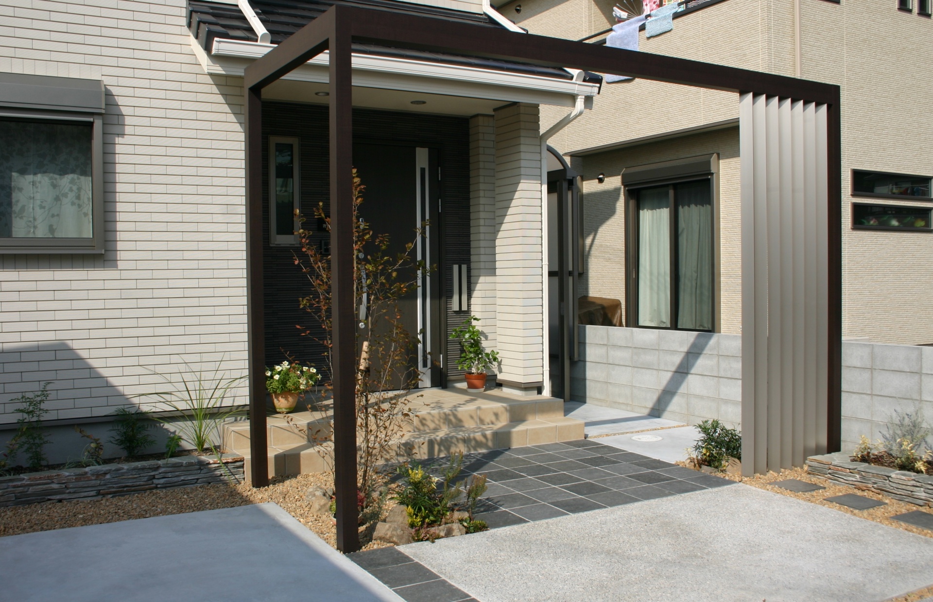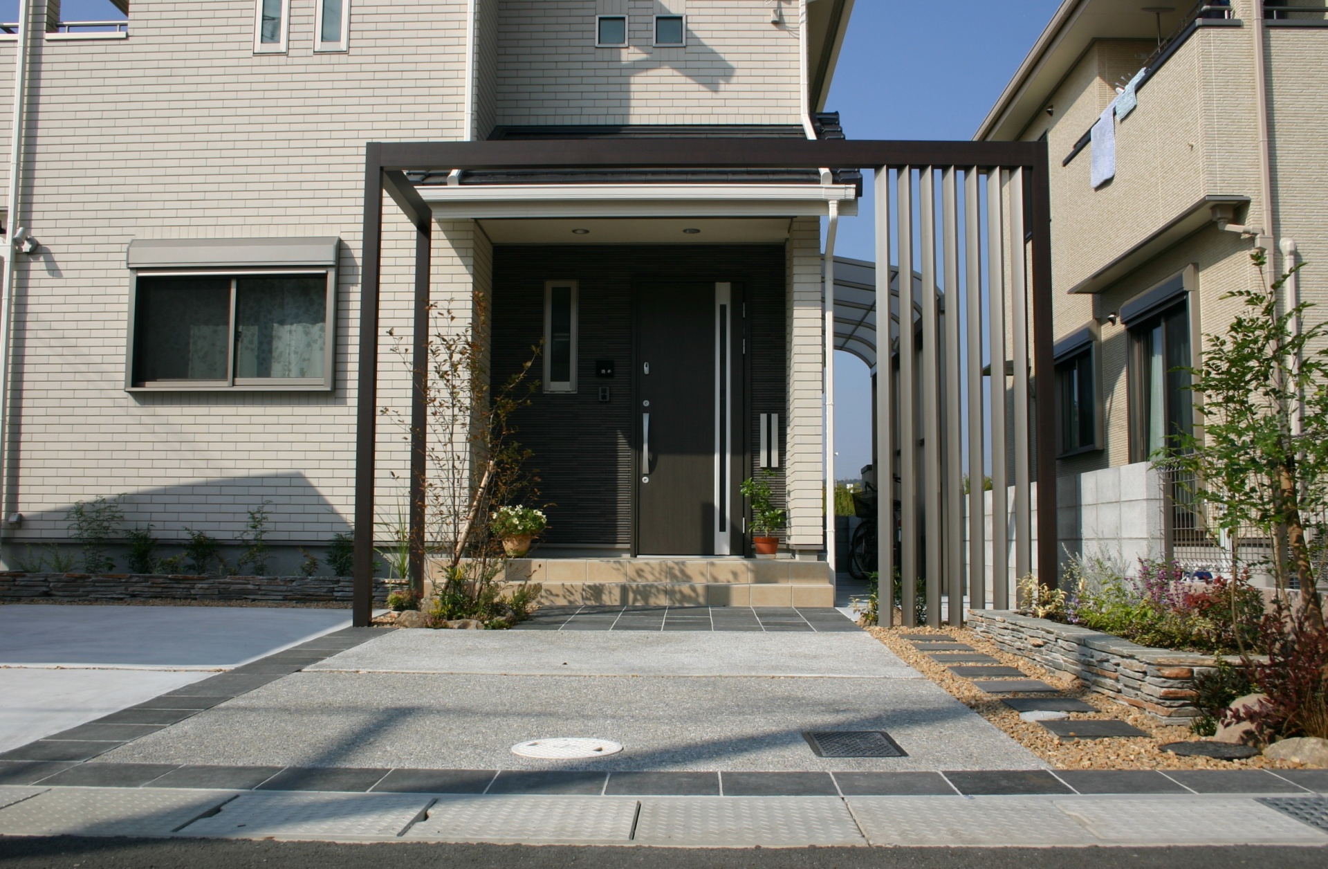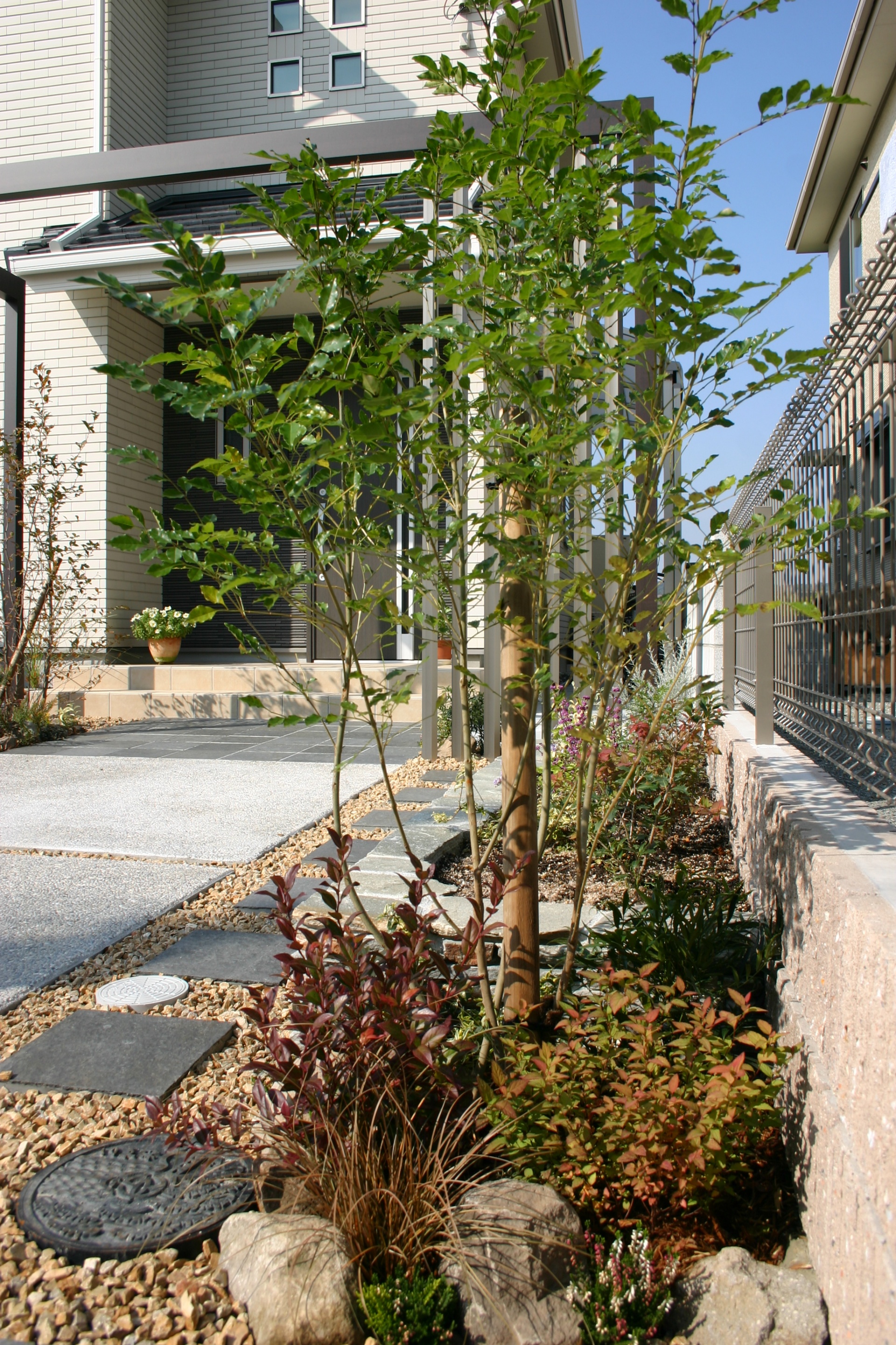 高砂市新築外構 自然石|プラスGで奥行きのあるエントランス空間 2013年12月10日 14:49 トータルデザイン 施工例,門周り 施工例,高砂・加古川・神戸新築エクステリア プラスG, 自然石 シンプルで上質な建物に合わせて、自然石で全体をコーディネートしています プラスGで玄関前を立体的に囲い、奥行きの感じられる空間となっています 統一性を持たせるのに、プラスGと一体のデザイン格子で駐輪場を目隠ししています before 平面・立面計画図 土間部分が多い中、要所に植栽スペースを設けて緑のある仕上がりとなっています デザイン格子を少し斜めに向ける事で、視線を遮ることが出来ます 道路際に少し高めな木を植える事で敷地の広がりを感じさせます