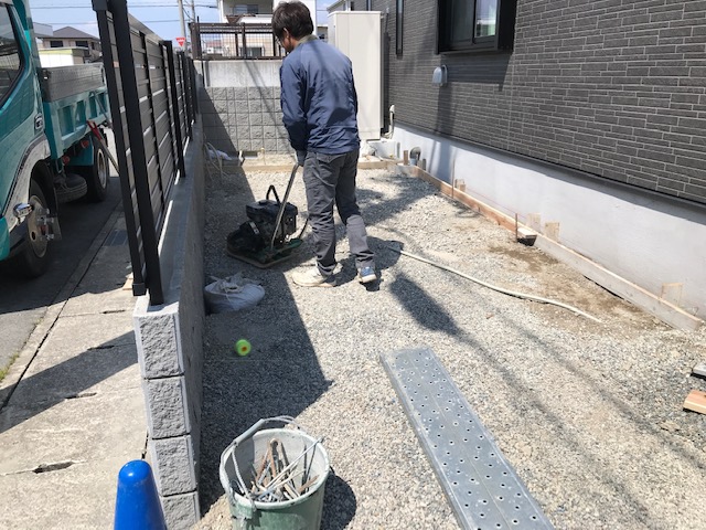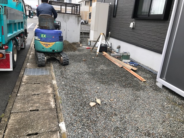 1日車庫スペースリフォーム 2025年12月5日 14:08 ブログ ウサギちゃんがピョンコ ピョンコ 12年前のOB様のお宅に訪問しました うさちゃんが芝生で遊んでました 私と同世代のお客様なのでもうお子さんが車を乗るころ 予備のスペースを砕石敷でご提案しました 表にもスペースがあるため 将来庭の拡張の時 砕石の方が扱いやすいですよとご提案 仮にヒノキ材で見切りを入れて完成1日プチリフォームの完成ですひがしぐち