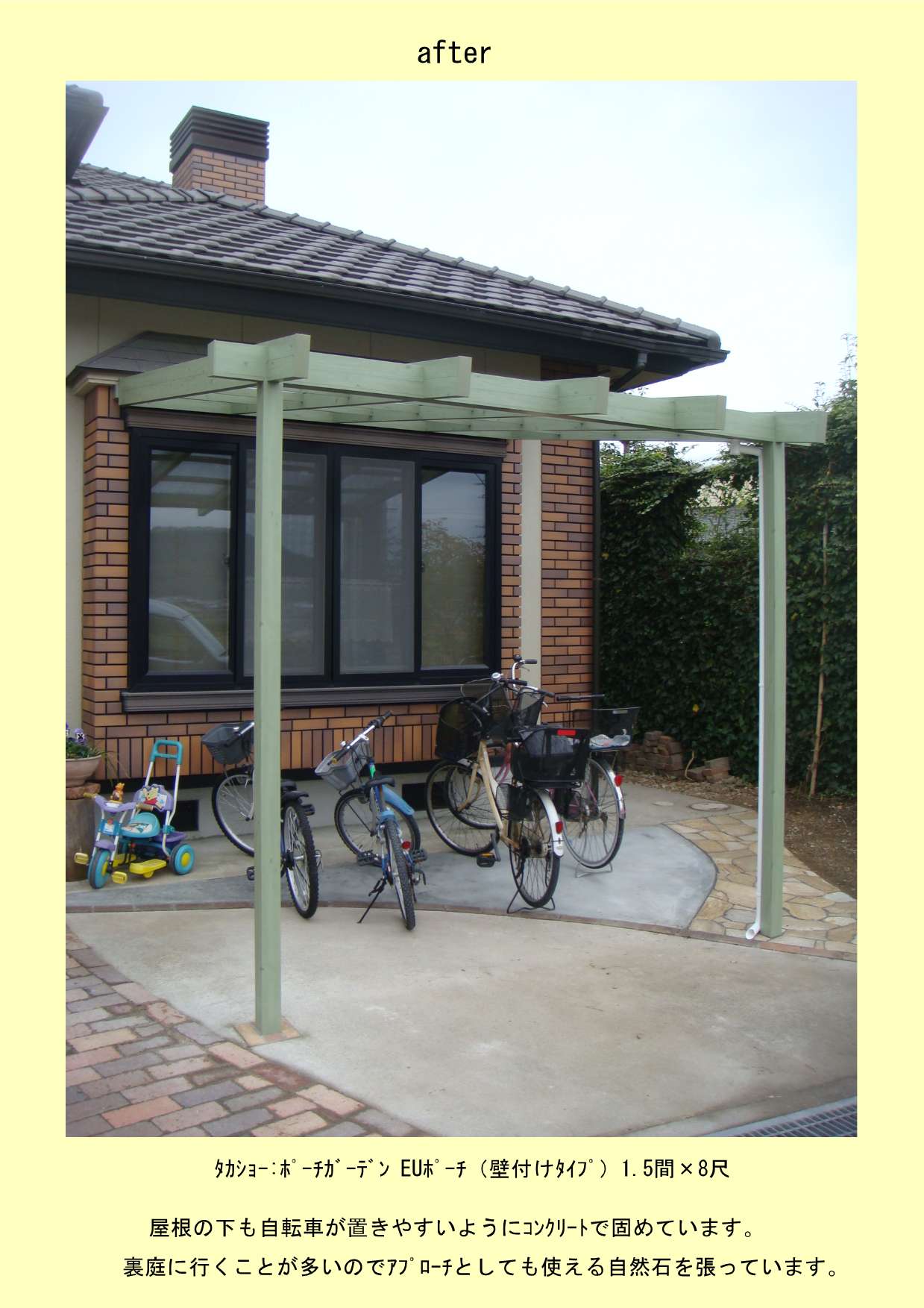 ビフォーアフター デザイン性のある自転車置き場 加古川市F様邸 自転車の数も増えてきたので駐輪場を作りたいというご要望でした。 祖父の部屋の前なので雨の日でも窓が開けれる方が良い。 玄関と隣接しているのでデザイン性のあるものをご希望されていました。