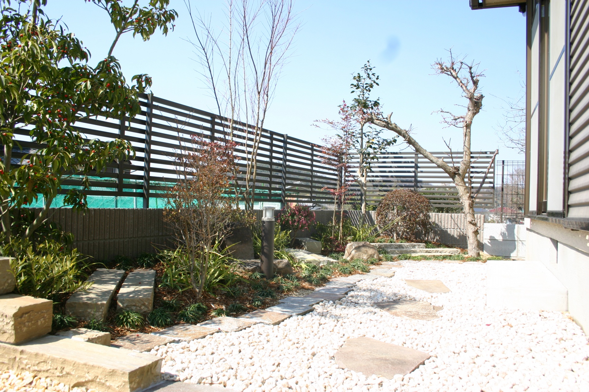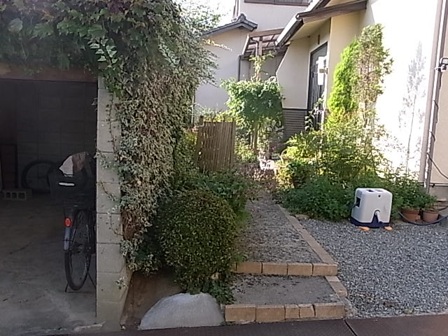 ビフォーアフター 日当たり良好のガーデンエクステリア 太子町N様邸 既設のコンクリートガレージが玄関前にあった太子町N様邸。今回裏側に車庫スペースを移動し南向きのガーデンスペースを多く取り入れたガーデンエクステリアにリフォームです。 今まで車庫の影になっていたアプローチが、植栽いっぱいの明るいイメージに変わりました。 今まで大事に育てられた植物たちも、新しいお庭に大移動しました。 明るい門周りに変わりました。 今まで手付かずだった和風スペースも 砂岩の延べ石を使った新しいデザインの坪庭に変わりました。