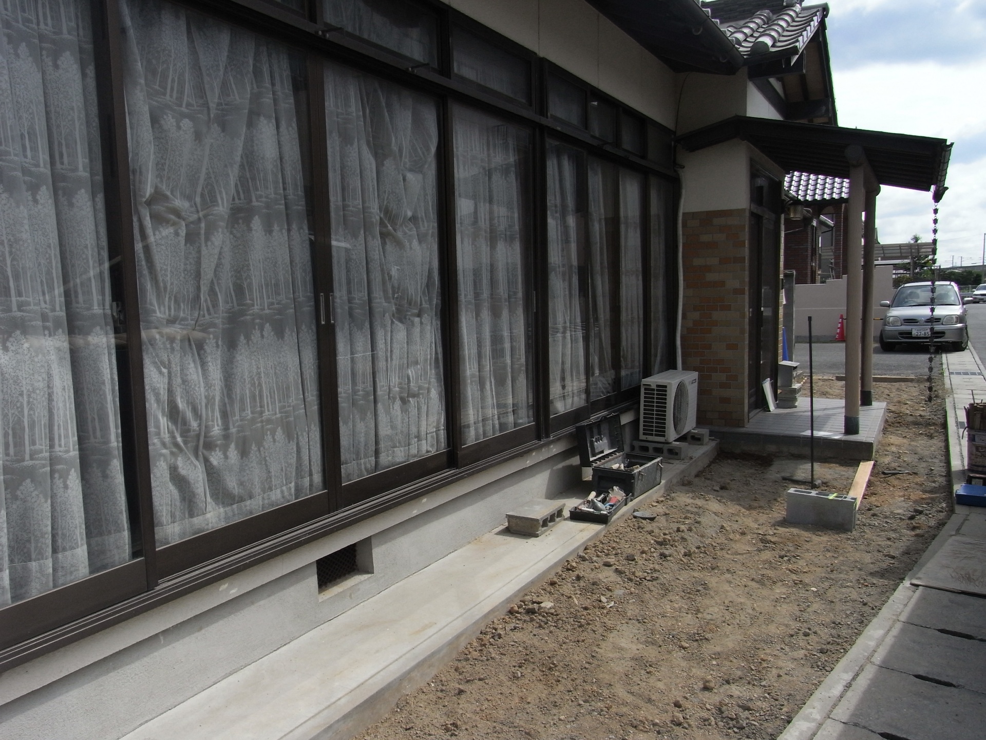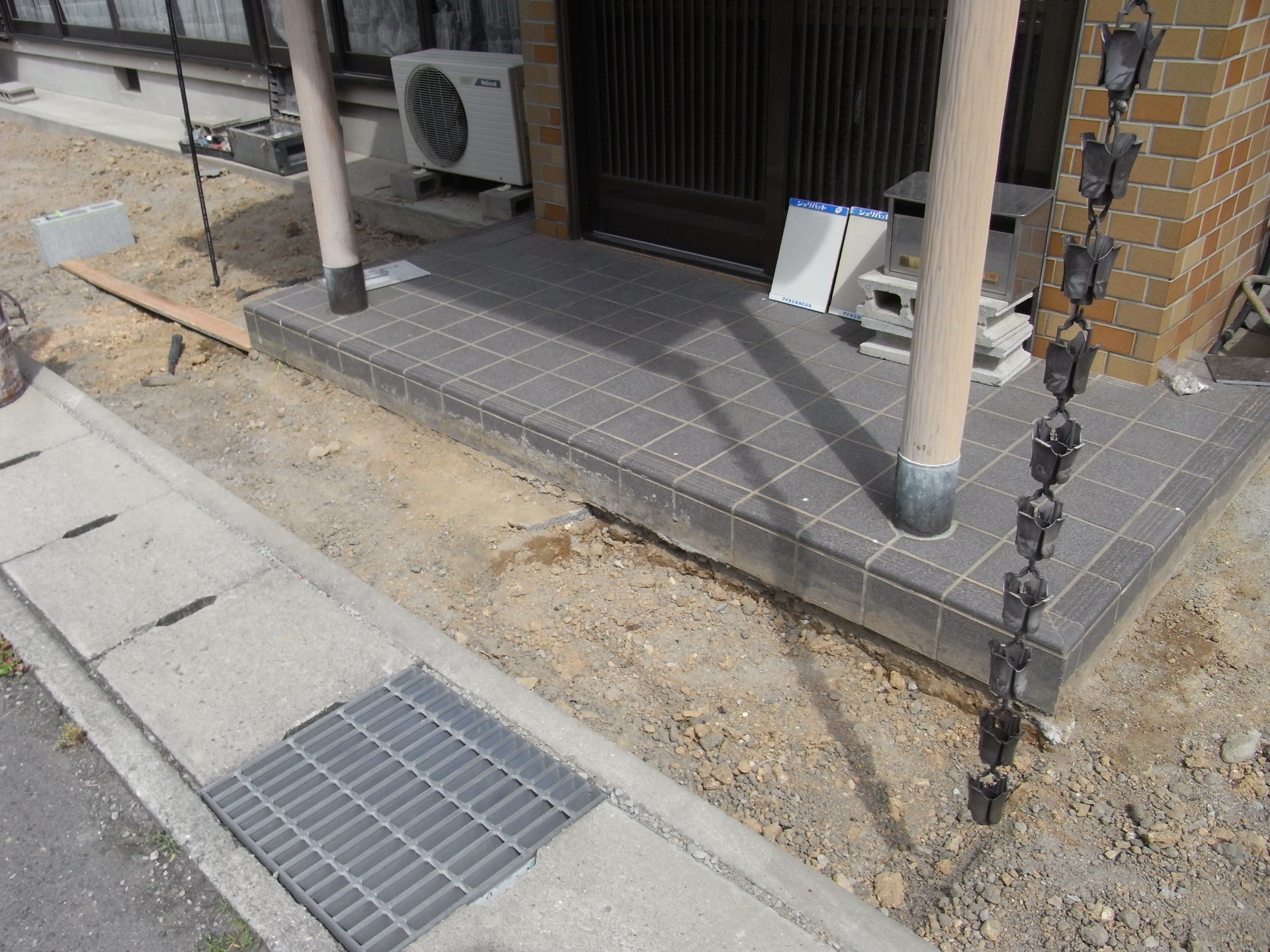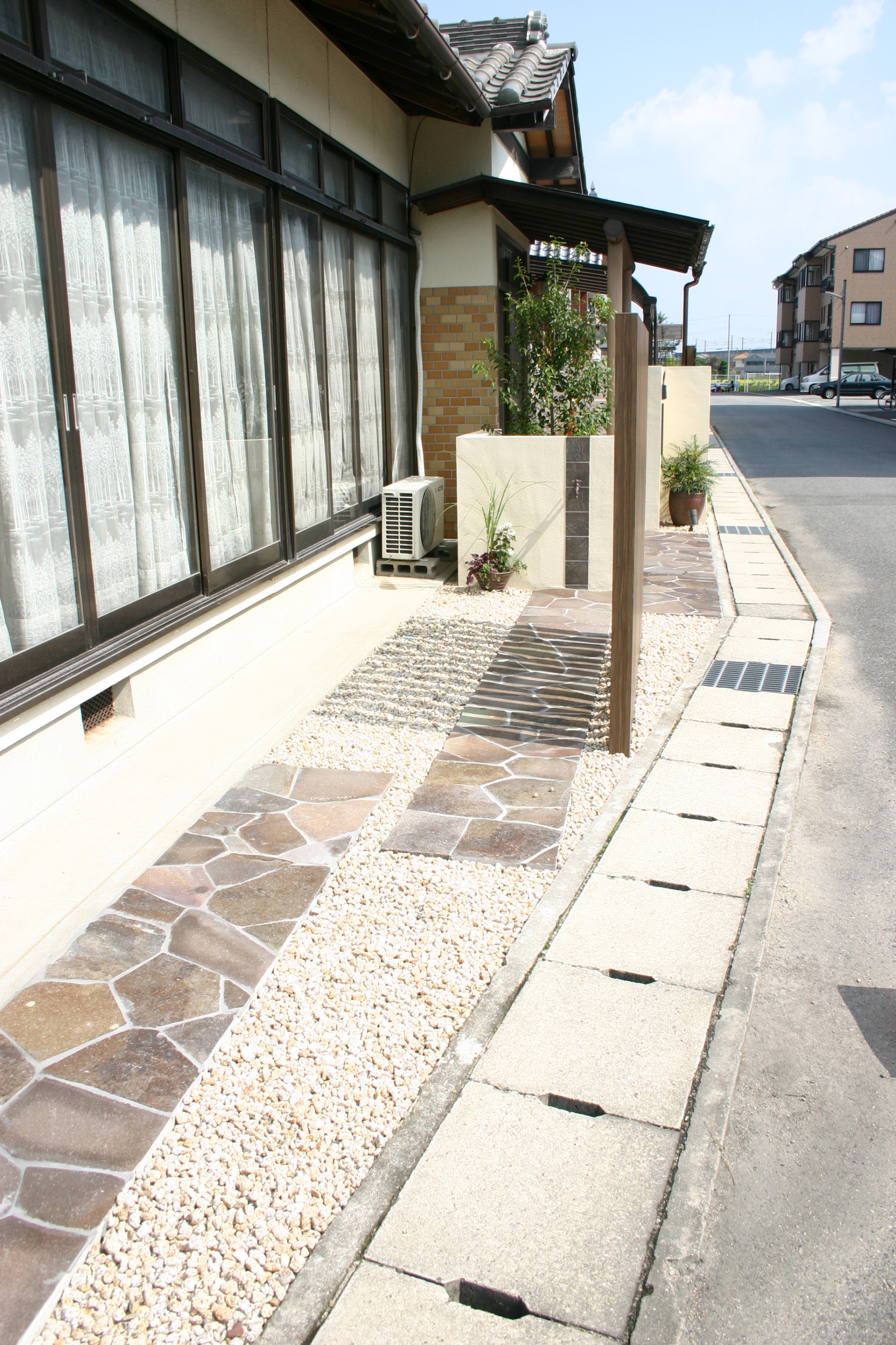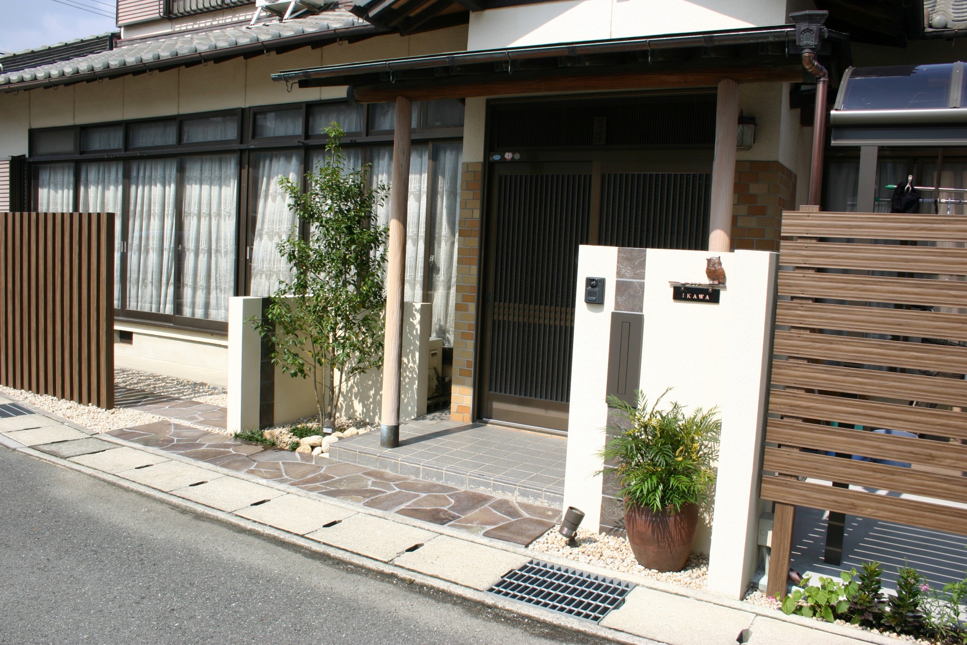 ビフォーアフター 風に揺れるソヨゴ たつの市I様邸 既設の古いテラスを撤去し新設の屋根とプライバシーを確保するためフェンス、門周りの御依頼でした。 門柱には吹付けとアクセントタイルの組み合わせ。土間は和風に合わせ鉄平石の乱貼りを施工。 テラス前にはアイアンウッドの横桟フェンスで道路からの目線を止めています。全体的に建物に合った和のイメージで仕上がりました。 和風の建物に合わせたべージュ系の吹付けにアクセントタイルの組み合わせ。天然のアイアンウッドフェンスがよく合います。 手つかずのテラス前でしたが 自然石のラインと化粧砂利でシンプルに仕上げ。 玄関前にはソヨゴを植樹。アイアンウッドのこげ茶と門柱のアイボリーとのバランスを考慮しました。