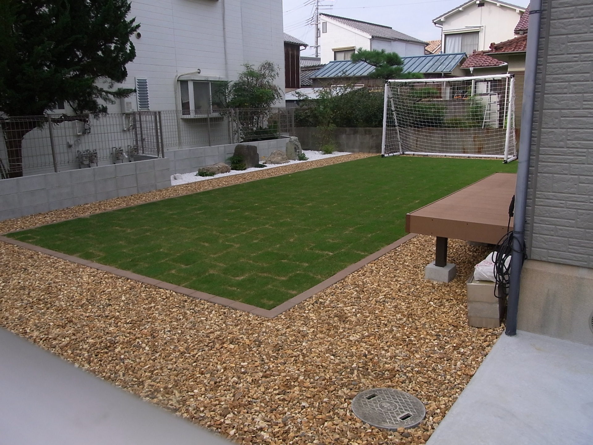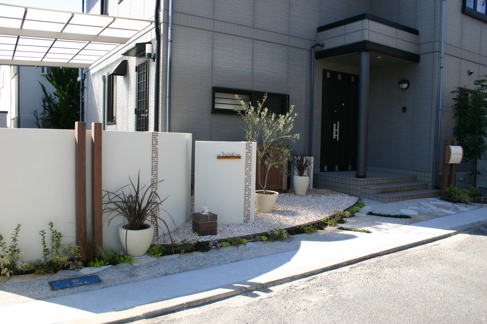 ビフォーアフター 曲線ウォールデザイン 赤穂市S様邸 北面玄関の赤穂市S様邸。門周りを明るいイメージにとのご要望でした。バイクスペースを建物サイドに設計し門周りをゆとりのあるデザインにしました。 ホワイトベースの壁にブラウン系のモザイクタイルをデザインしました。 既設の土塀を新たにブロックでやり替えます。 お子様とサッカーのできるミニグランドに変わりました。