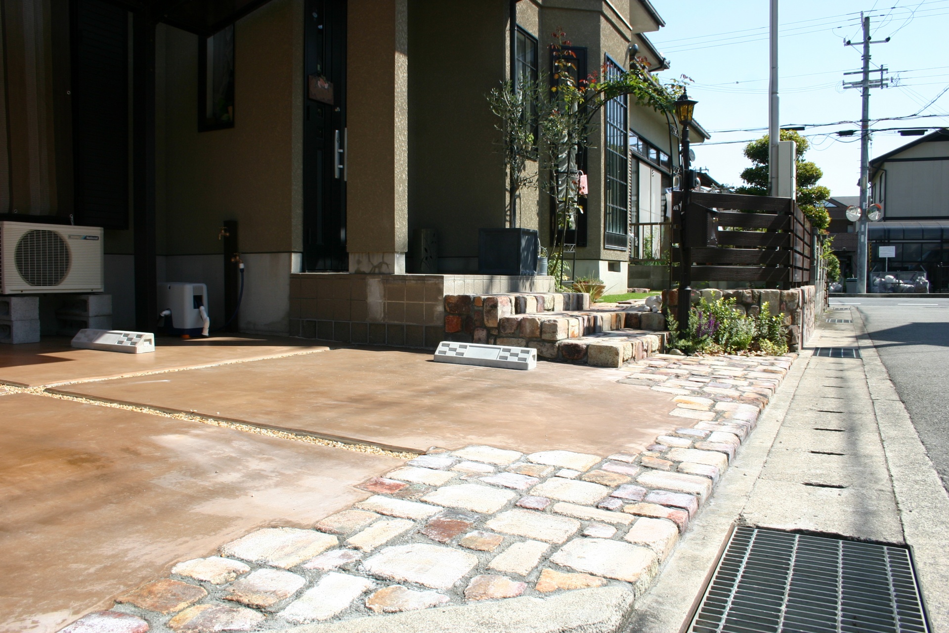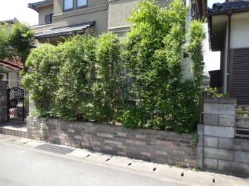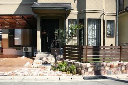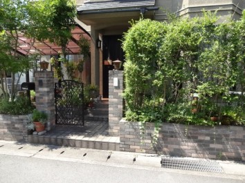 ビフォーアフター 植栽を減らしすっきりとしたお庭にリフォーム たつの市Y様邸 植木が大きくなりすぎて手入れが難しくなってきたので、もっと植栽を減らしたいとのことでした 車の駐車スペースを増設するのをきっかけに、すっきりとオープン仕様の外構に変化しました 木々が大きくなり手入れが億劫な門周りをすっきりとさせたいとのことでした 門扉を取り外し高さのある門柱を設けず開放的な門周りとなりました 生垣で仕切っていました道路際の塀を光が入る明るい雰囲気にされたいとのご要望でした お客様のお好きなアンティークなイメージを踏まえて耐火煉瓦の塀にディーズガーデン:アルファウッドフェンスを組み合わせました 花壇があると車庫スペースが2台分止まらないので広く使われたいとのことでした 花壇を撤去し、既存のインターロッキングを耐火煉瓦とカラークリートにリフォームしました