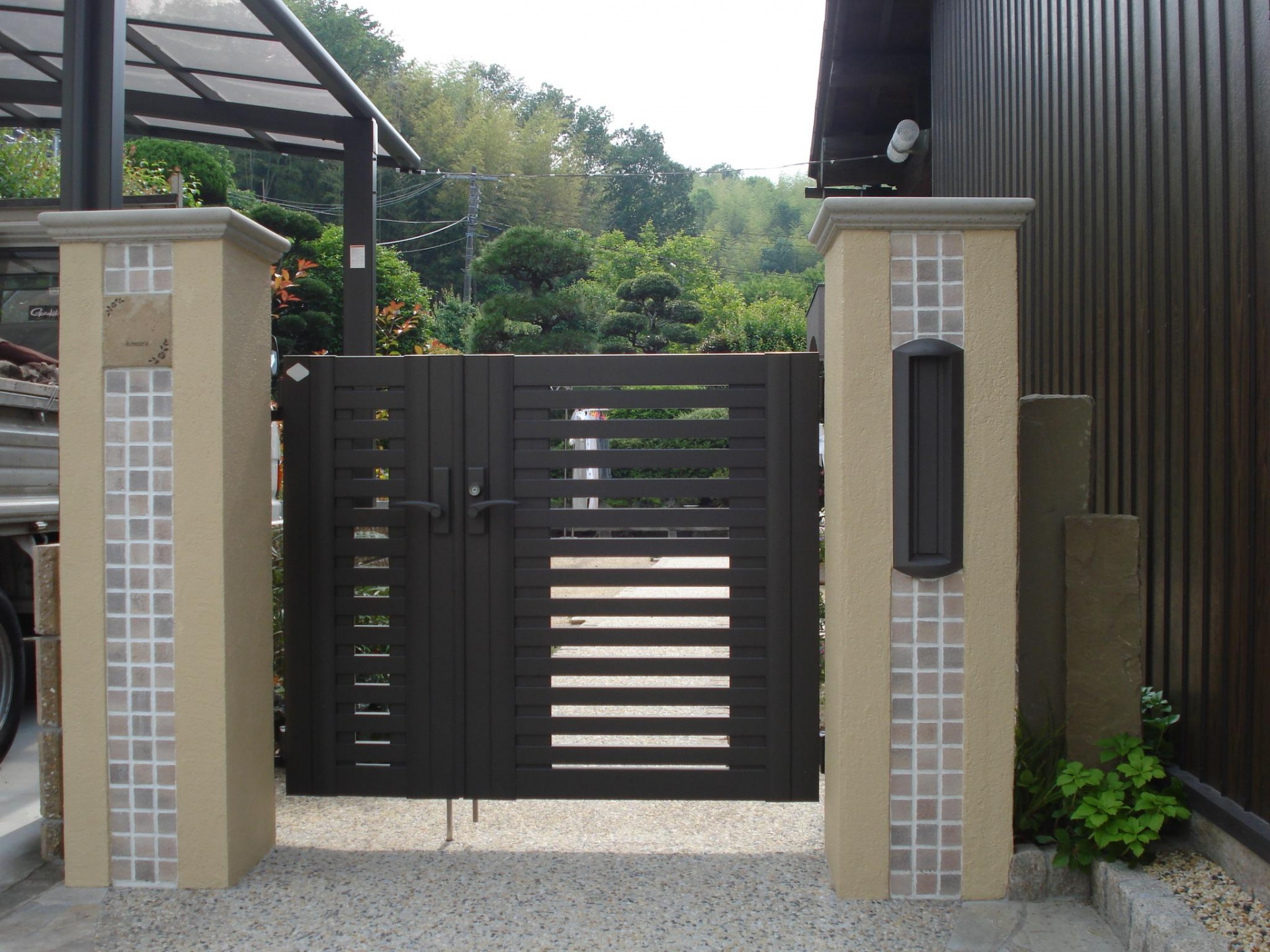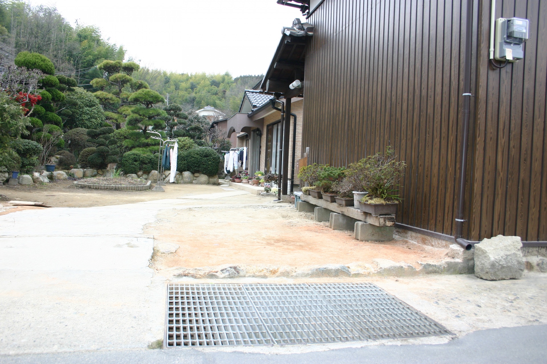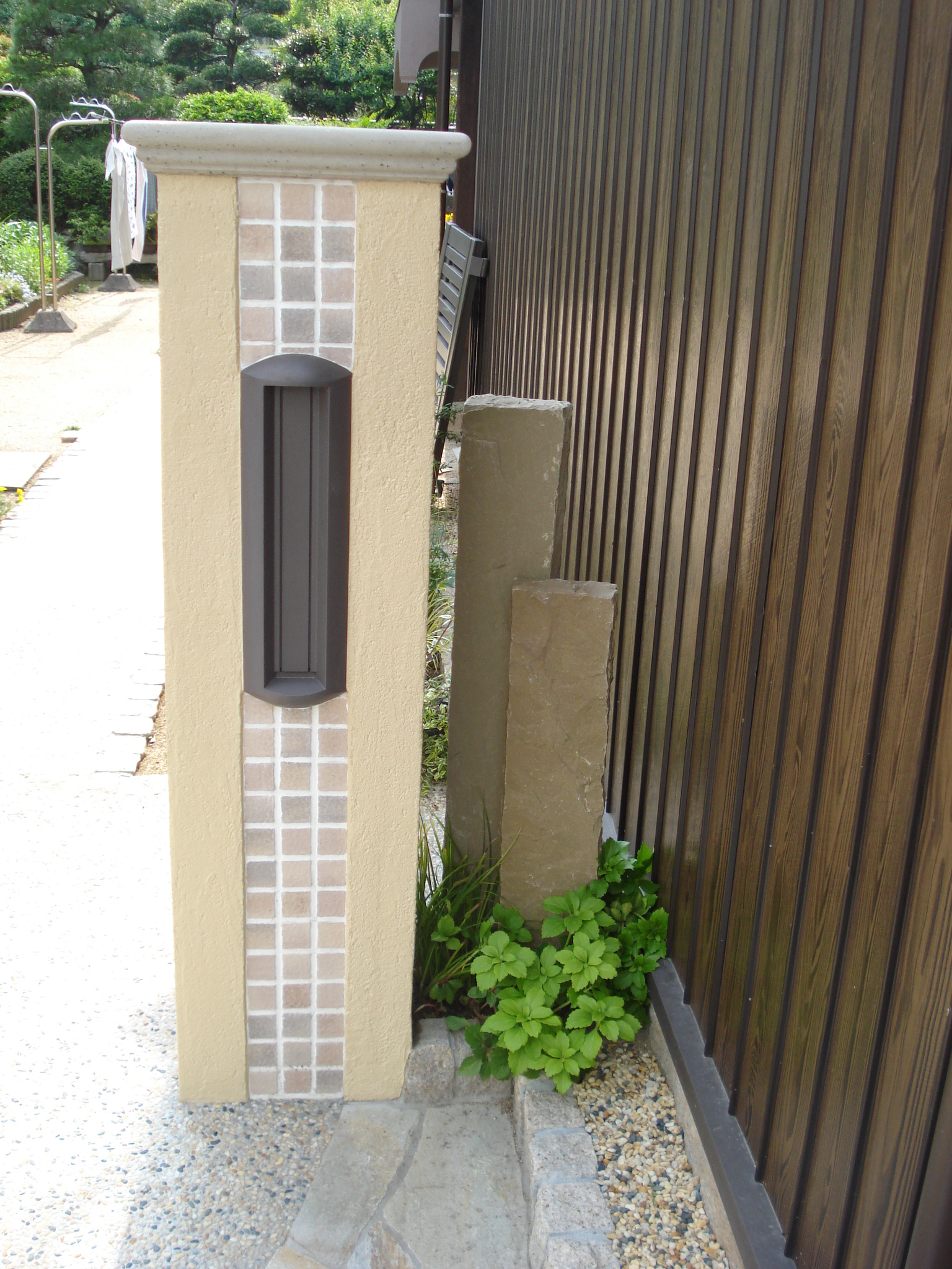 ビフォーアフター 和と洋の組み合わせ 太子町K様邸 ご自宅の建て替えと納屋のリフォームに伴って門周りもきれいにしたいとご来店いただきました。 洋風の建物に合わせ、明るい色の角門柱をアプローチの両側に据えました。仕上げには少し粗めの骨材を混ぜて、真ん中には少し大きめのモザイクタイルを張りました。床面は和風の「洗い出し仕上げ」にしましたが、石は「フリージア」を使用したので、明るい色になっています。右側に据えたインド砂岩の色合いが、洋にも和にもマッチしています。 インド砂岩の足元に植えられたフッキソウの色がとても鮮やかです。