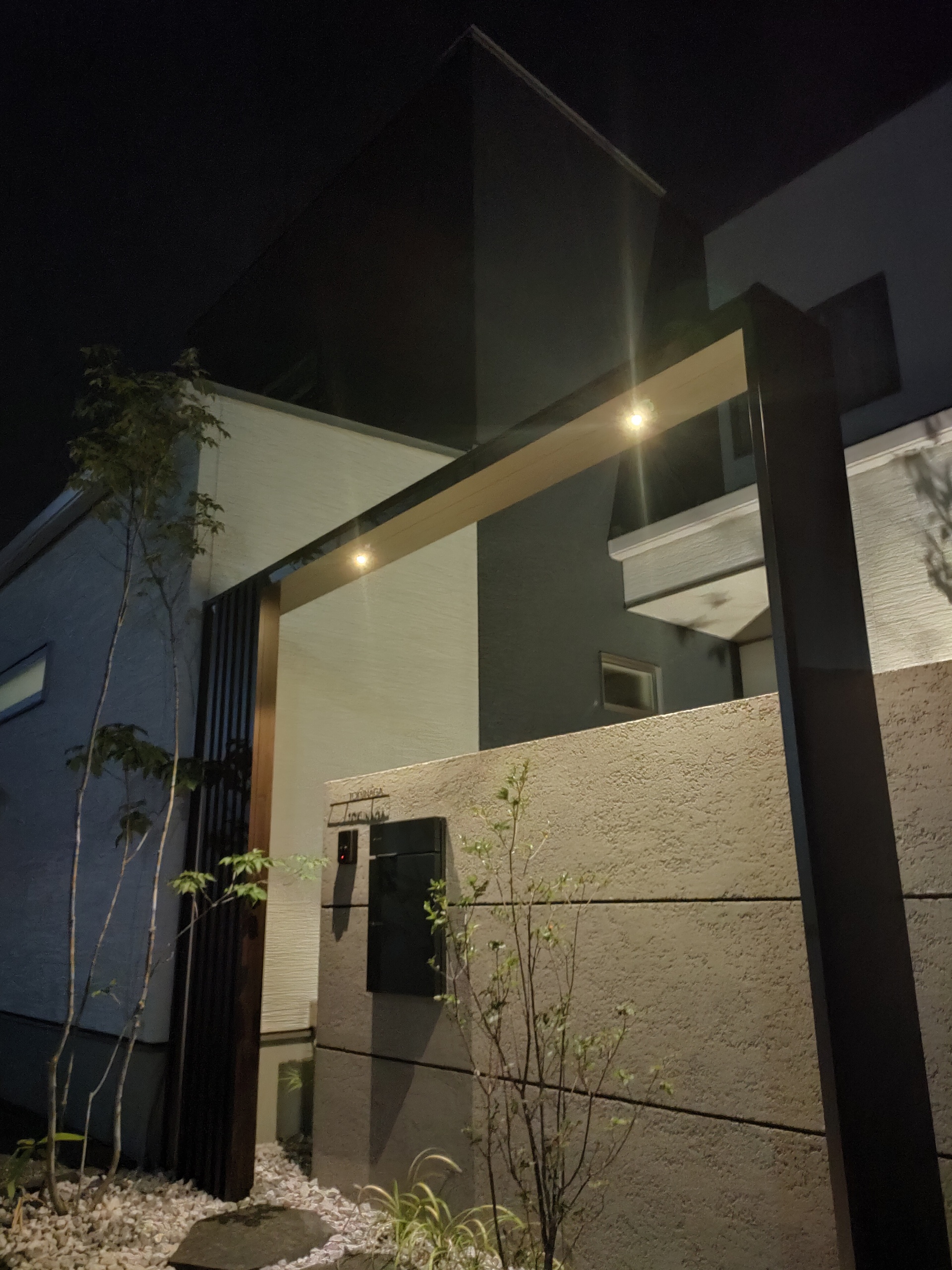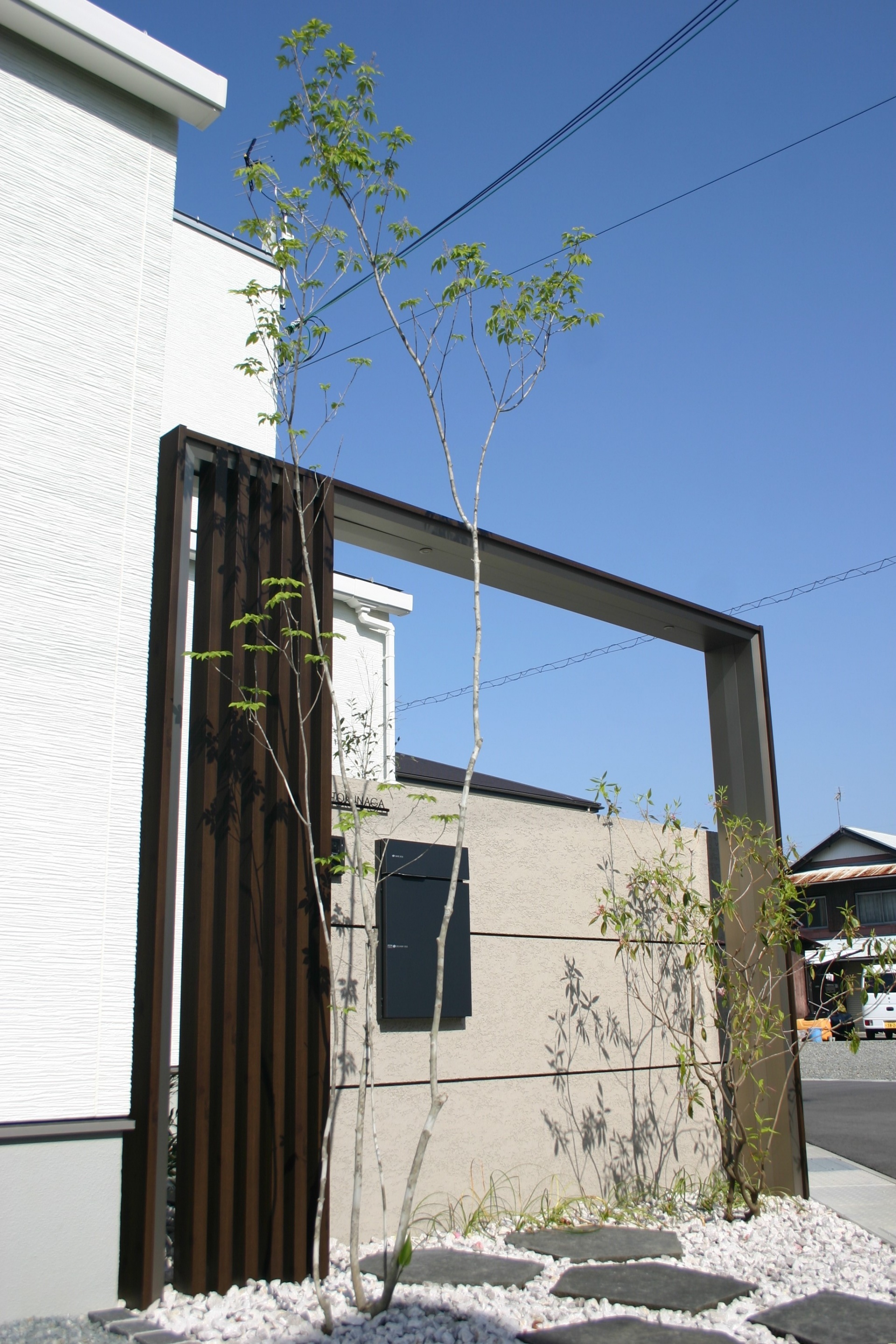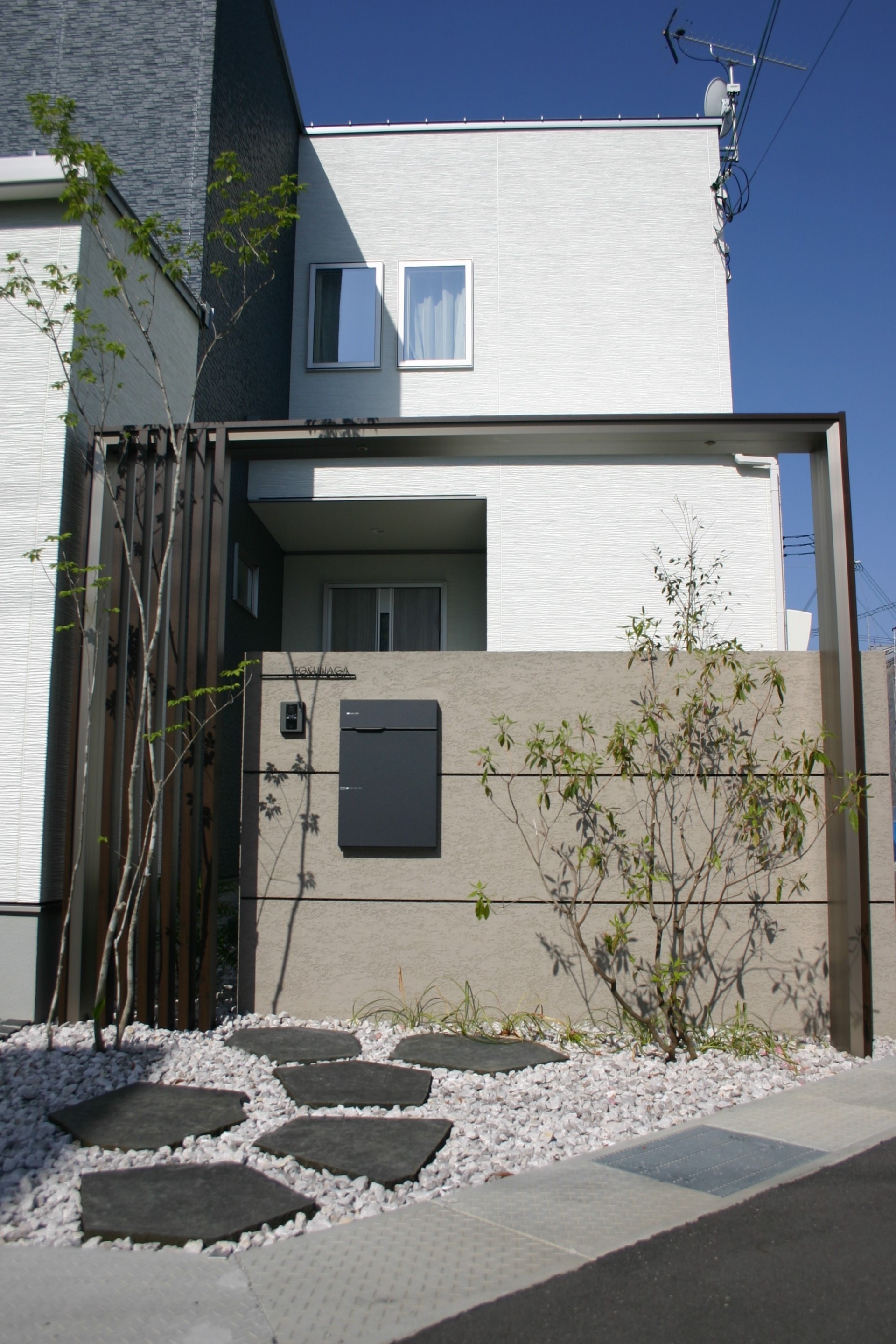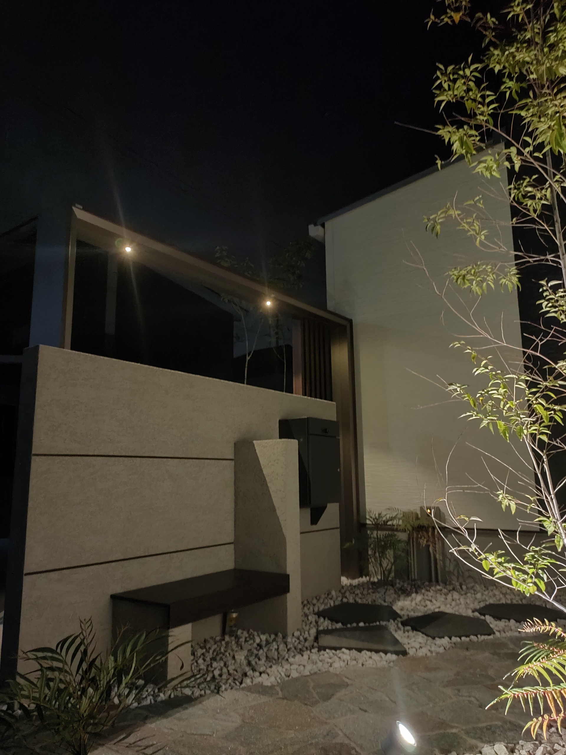 スタイル別施工実績 太子町新築外構 アーチでエントランスを素敵に魅せるエクステリアデザイン シンプルな外観にインパクトを与える様に玄関前に目隠しも兼ねた吹付け仕上げの門柱を設けています そこに木調色のアーチを設けることで立体的になり空間をダイナミックに魅せる効果があります要所に配置した植栽も高低差をつけエントランスを素敵に魅せるエクステリアデザインとなっています角地の敷地条件を利用したアプローチ導線もいい感じになりました before image pars 門柱に被るように設けた木調色のアーチ全体的な色目も落ち着いたベージュや茶系を使用しこげ茶のアーチや縦格子スリットがアクセントになります玄関正面からの導線は遮断し 角地の隅切り部分からのアプローチとなっていますアプローチ際にも植栽があり玄関側から見ても素敵な外構となっています 建物外観がシンプルなのでエントランスの方に少しアクセントをつけるのに木調アーチと縦のスリットを門柱と重ね合わせ、その前後に植栽を配置し立体感があります アーチに取付けたダウンライトで門周りが照らされ存在感のあるエントランスになりました 植木足元のスポットライトで壁面に映った陰影も迫力があります 玄関が門柱や縦格子スリットで目隠しされています涼しげな枝ぶりの植栽を門回りに配置し柔らかい朝日が差し込むと門柱に影を落とします 木調アーチよりダウンライトで門回りを照らします玄関のダウンライトとリンクし統一感があり綺麗ですトラバーチン仕上げの吹付け門柱の表情も浮かび上がります 斜めより導線をとった自然石乱張りアプローチ端部は張りっぱなしで自然で小道風なイメージ宅配ポストの取出しには大判の飛石があります 植木を足元から照らすスポットライトが外壁に影を落とし迫力があります玄関までの誘導灯としてもお使いいただけます 建物がシンプルなデザインなので外構でボリューム感をだしたい とご要望されていましたT様現地調査に伺った際にある程度の外構プランの構想を練ることが出来ました持ち帰り図面に出来た時はイメージ以上のプランになった事を覚えていますお客様も壁だけで目隠しも兼ねた門柱をイメージされていましたそのイメージに+αのデザインをご提案することでお客様にもご納得いただけたのかと思います完成後に「格好良い家になった!」と ご満足されているお言葉を頂け嬉しかったです お客様の声 ▼数ある中からエクステージをお選び頂きました理由をお聞かせ下さい。 デザイン。 ▼ご感想・お気付きの点をお聞かせ下さい 親身に対応して頂き感謝しています。デザインもセンスよく格好良い家になりました。ありがとうございました。