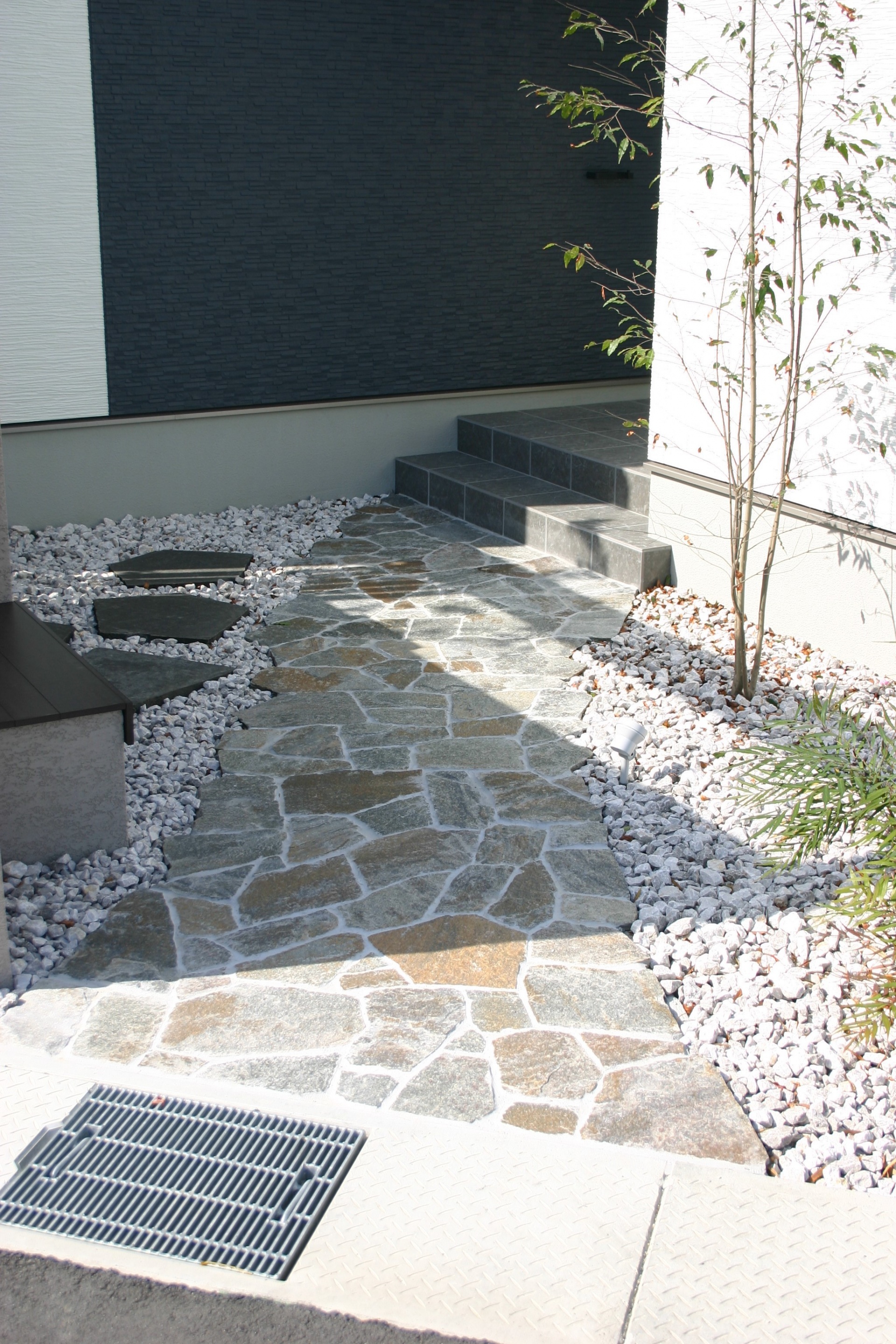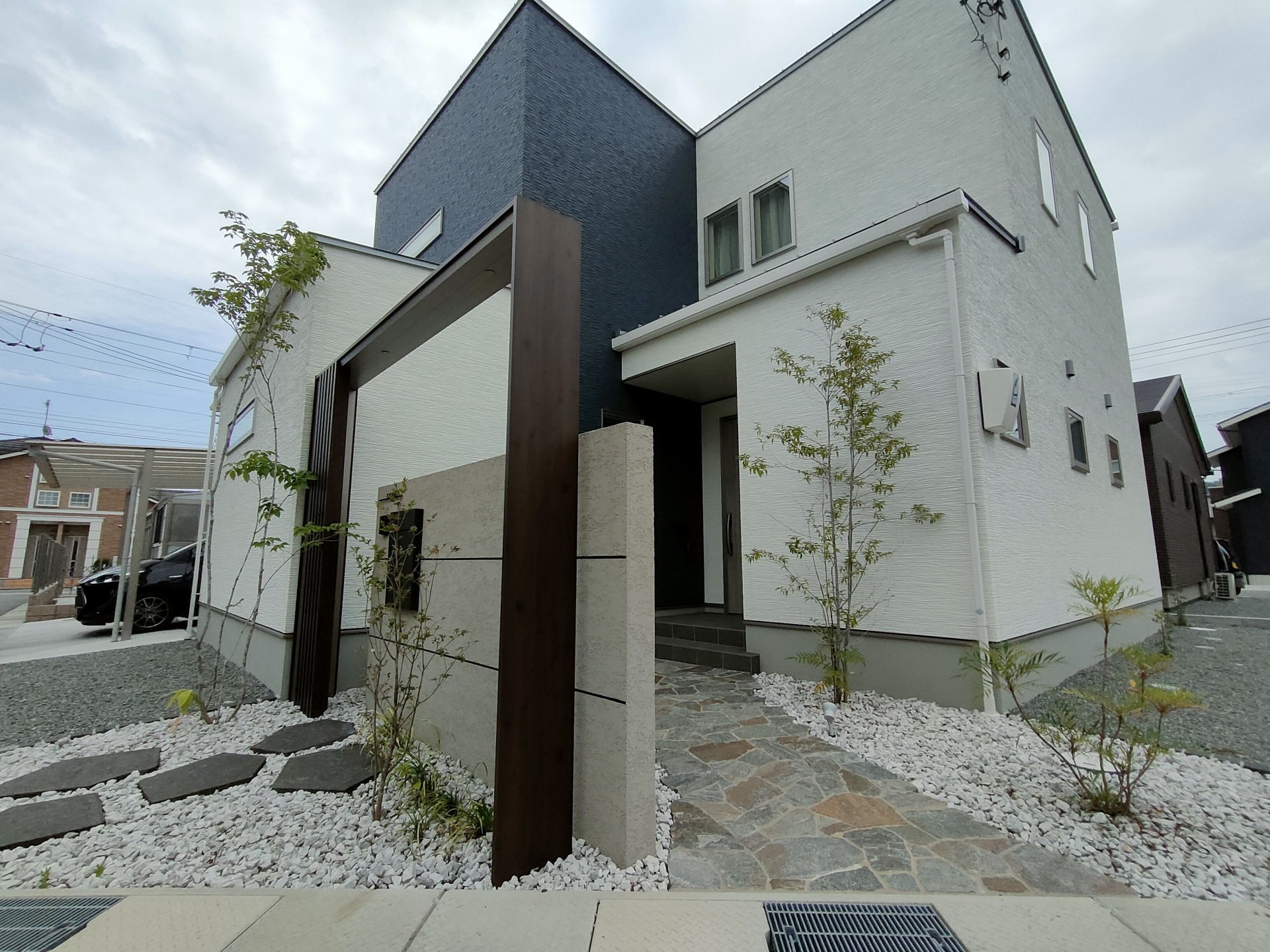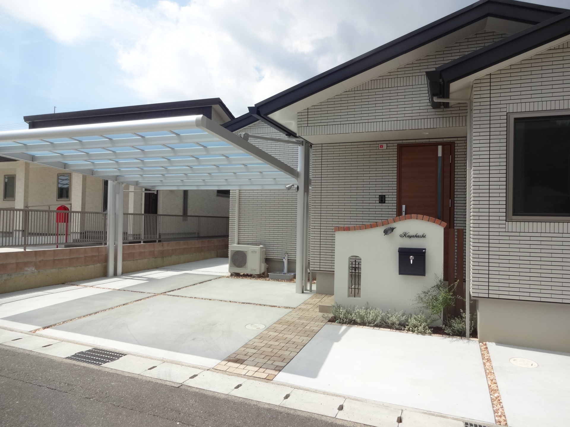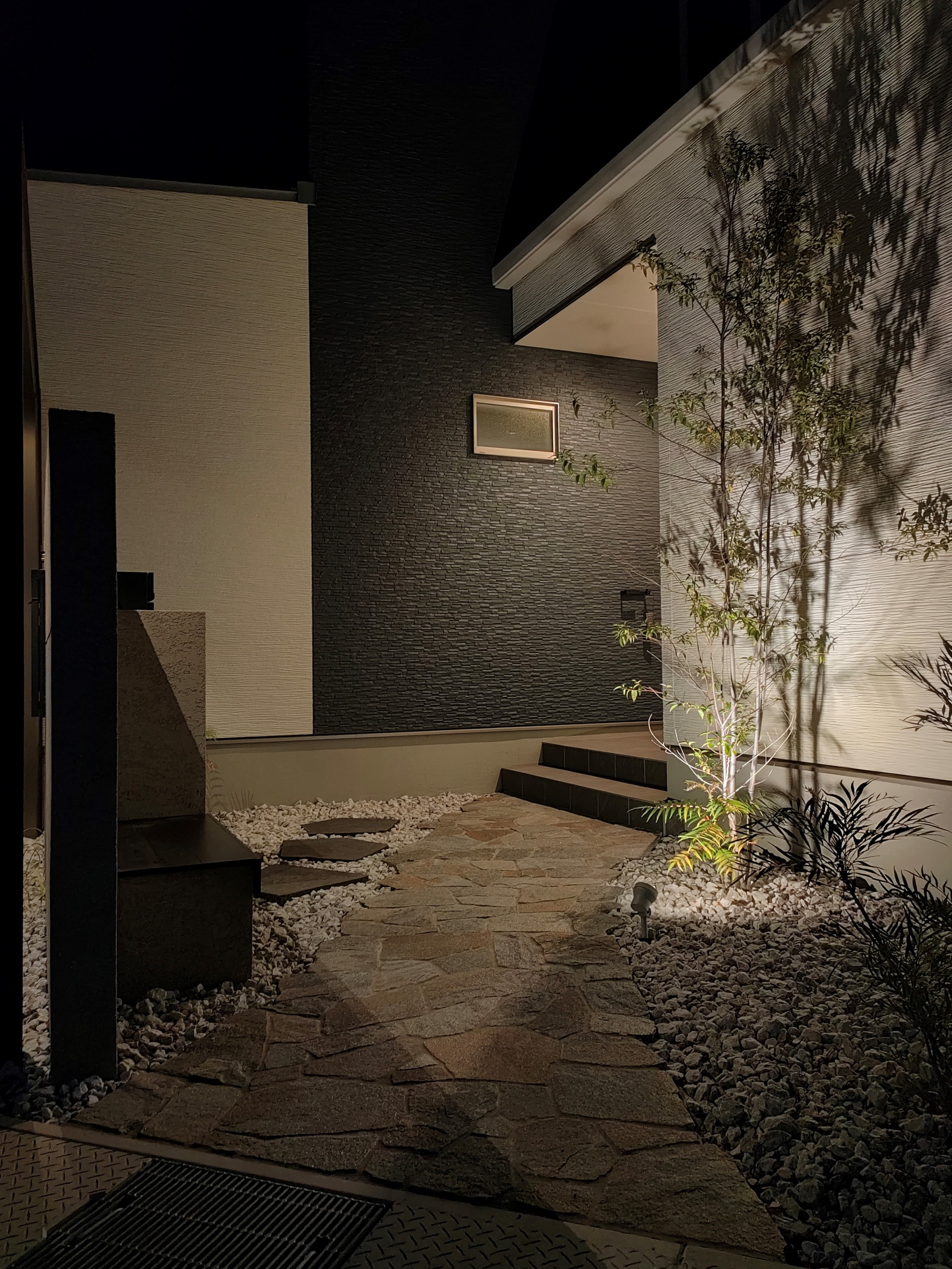 スタイル別施工実績 太子町新築外構 アーチでエントランスを素敵に魅せるエクステリアデザイン シンプルな外観にインパクトを与える様に玄関前に目隠しも兼ねた吹付け仕上げの門柱を設けています そこに木調色のアーチを設けることで立体的になり空間をダイナミックに魅せる効果があります要所に配置した植栽も高低差をつけエントランスを素敵に魅せるエクステリアデザインとなっています角地の敷地条件を利用したアプローチ導線もいい感じになりました before image pars 門柱に被るように設けた木調色のアーチ全体的な色目も落ち着いたベージュや茶系を使用しこげ茶のアーチや縦格子スリットがアクセントになります玄関正面からの導線は遮断し 角地の隅切り部分からのアプローチとなっていますアプローチ際にも植栽があり玄関側から見ても素敵な外構となっています 建物外観がシンプルなのでエントランスの方に少しアクセントをつけるのに木調アーチと縦のスリットを門柱と重ね合わせ、その前後に植栽を配置し立体感があります アーチに取付けたダウンライトで門周りが照らされ存在感のあるエントランスになりました 植木足元のスポットライトで壁面に映った陰影も迫力があります 玄関が門柱や縦格子スリットで目隠しされています涼しげな枝ぶりの植栽を門回りに配置し柔らかい朝日が差し込むと門柱に影を落とします 木調アーチよりダウンライトで門回りを照らします玄関のダウンライトとリンクし統一感があり綺麗ですトラバーチン仕上げの吹付け門柱の表情も浮かび上がります 斜めより導線をとった自然石乱張りアプローチ端部は張りっぱなしで自然で小道風なイメージ宅配ポストの取出しには大判の飛石があります 植木を足元から照らすスポットライトが外壁に影を落とし迫力があります玄関までの誘導灯としてもお使いいただけます 建物がシンプルなデザインなので外構でボリューム感をだしたい とご要望されていましたT様現地調査に伺った際にある程度の外構プランの構想を練ることが出来ました持ち帰り図面に出来た時はイメージ以上のプランになった事を覚えていますお客様も壁だけで目隠しも兼ねた門柱をイメージされていましたそのイメージに+αのデザインをご提案することでお客様にもご納得いただけたのかと思います完成後に「格好良い家になった!」と ご満足されているお言葉を頂け嬉しかったです お客様の声 ▼数ある中からエクステージをお選び頂きました理由をお聞かせ下さい。 デザイン。 ▼ご感想・お気付きの点をお聞かせ下さい 親身に対応して頂き感謝しています。デザインもセンスよく格好良い家になりました。ありがとうございました。