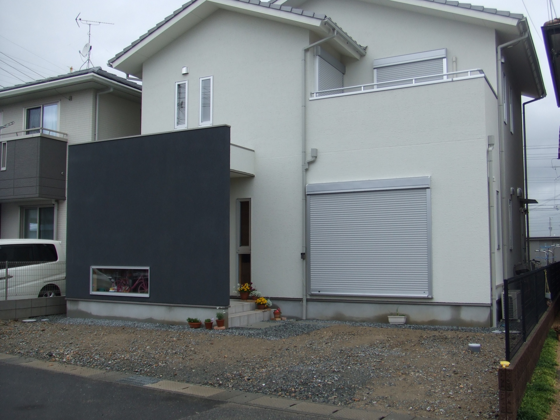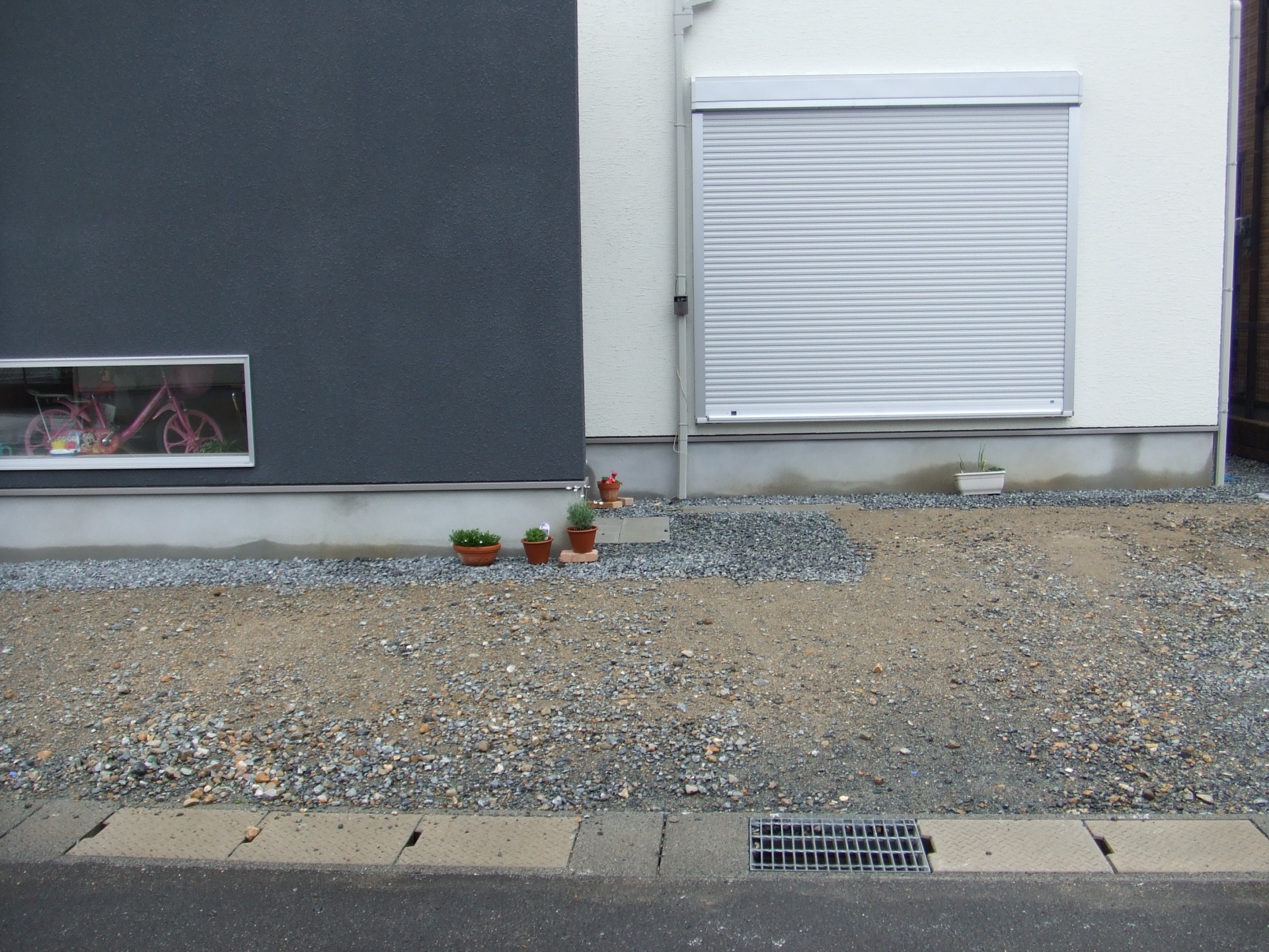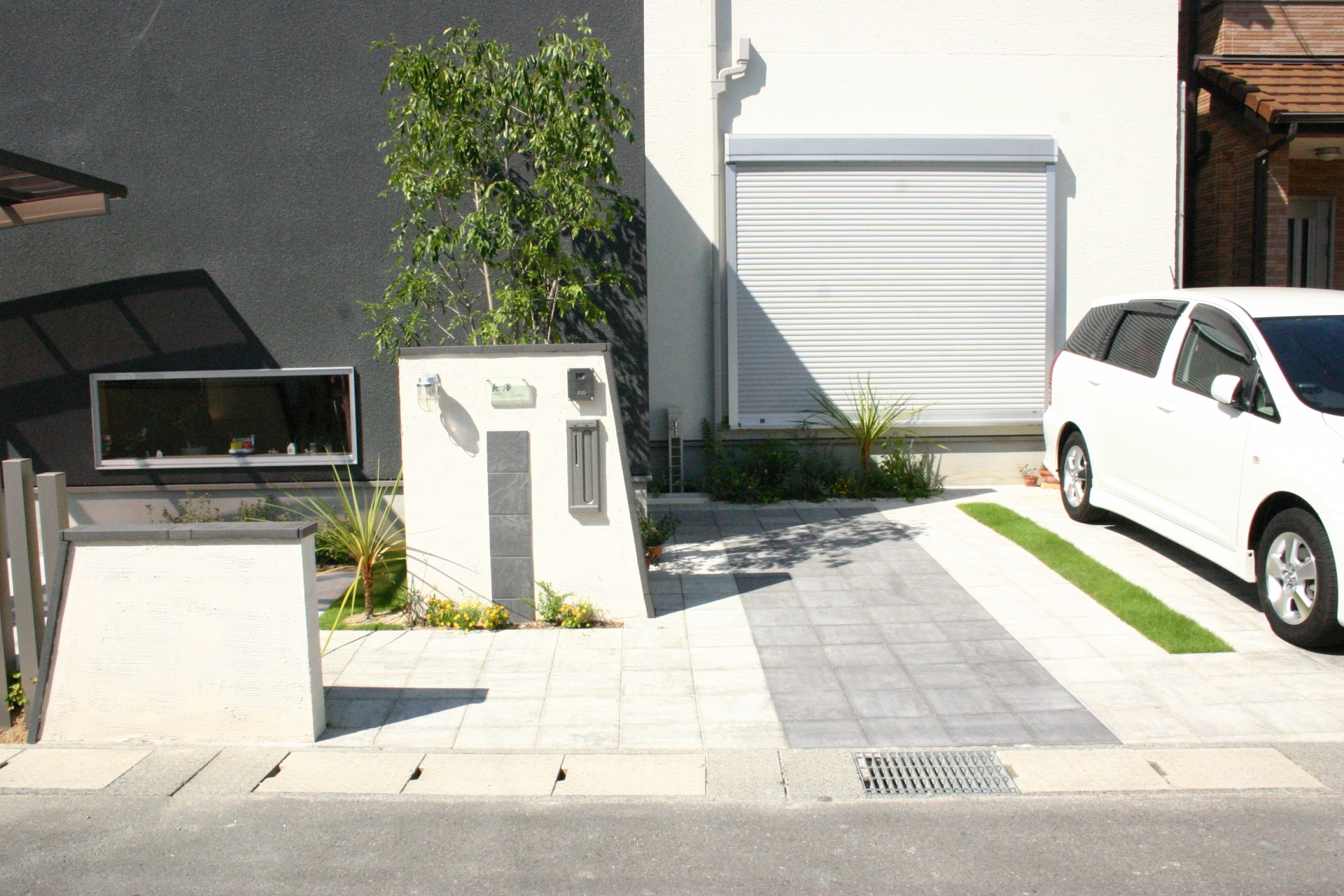 ビフォーアフター 台形門柱 姫路市N様邸 玄関部の壁が濃紺色のアクセントになっているN様邸。他にはないデザインをとのことでした、門柱・塀は台形をデザインしてグレーの笠木をアクセントにしました。車庫スペースはリビング前の為照り返しを考慮しコンクリート平板にて施工しました。 濃紺のアクセントウォールと調和したエクステリアデザイン。 砂利のままだったアプローチも サブパーキングスペース兼用アプローチに。