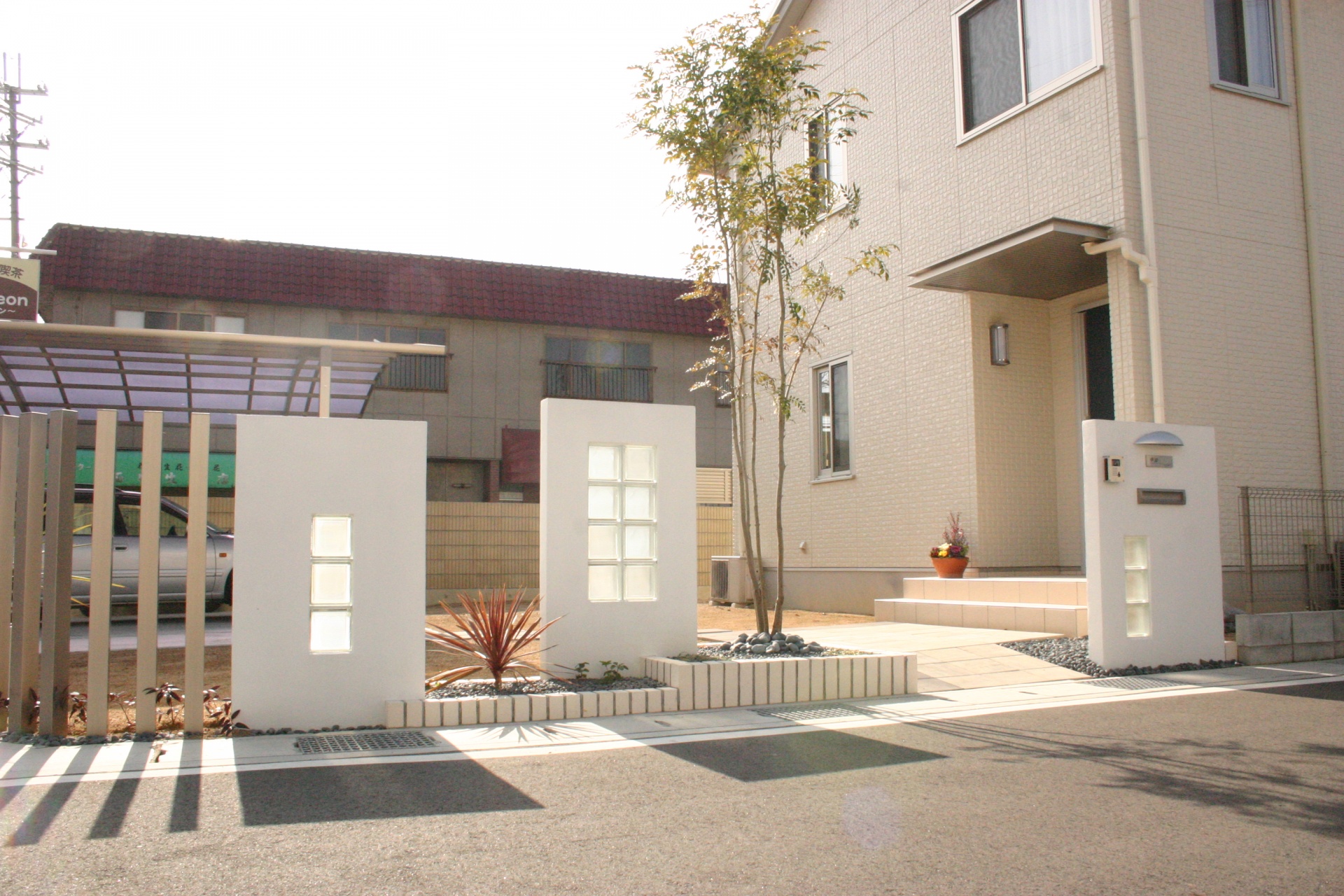 ビフォーアフター ガラスブロックの光 たつの市N様邸 白い外壁のたつの市N様邸 門柱部ののみ施工されておられましたが、アプローチ・塀は手付かずのままでした。シンプルで冷たいイメージをとのご希望で、ホワイトの塀にストライプのガラスブロックを組み合わせました。ホワイトレンガのFBOXには黒の那智石を敷き詰めモノトーン調にデザインしました。 南面より差し込み太陽の光がガラスブロックを通過します。