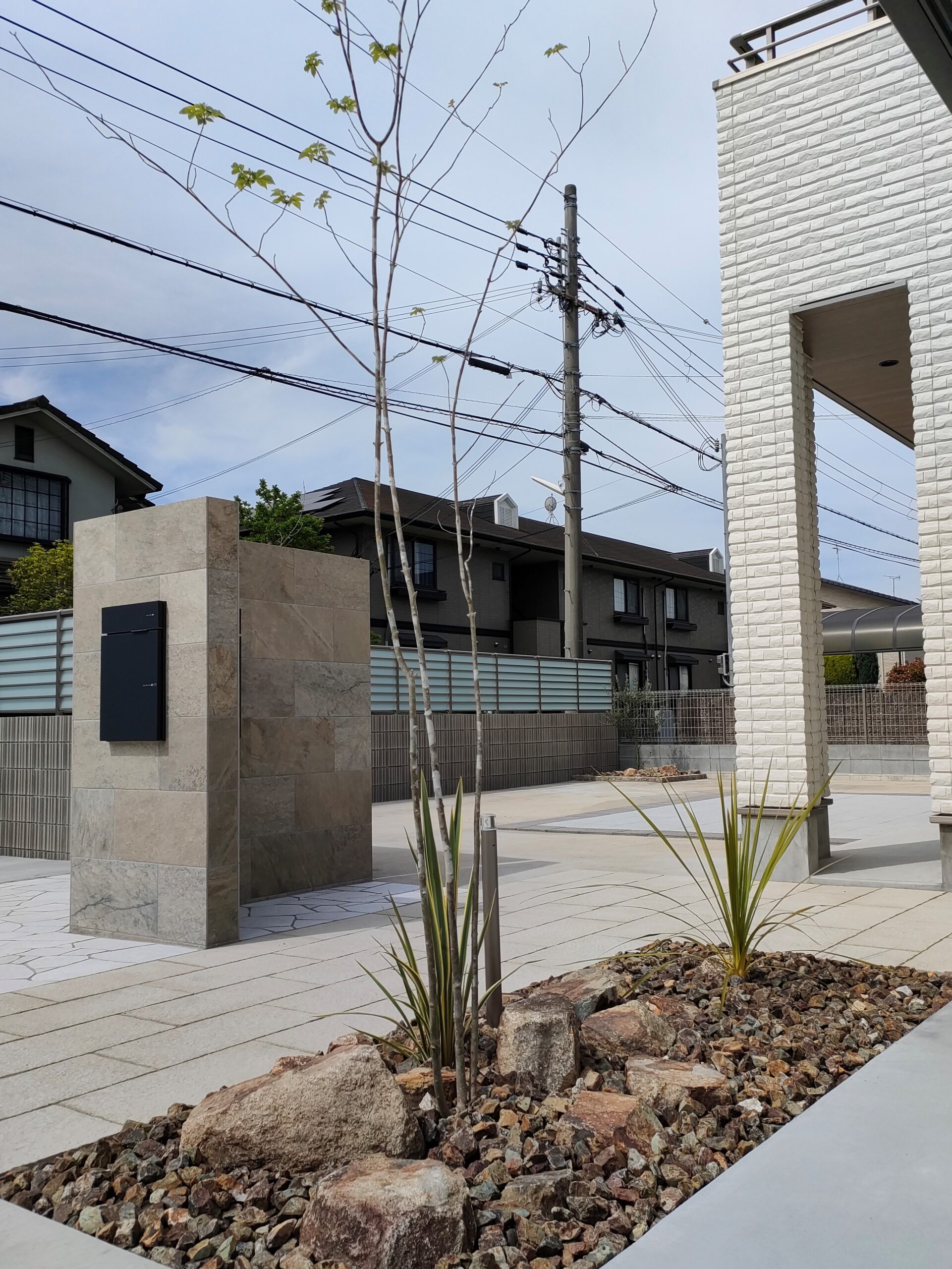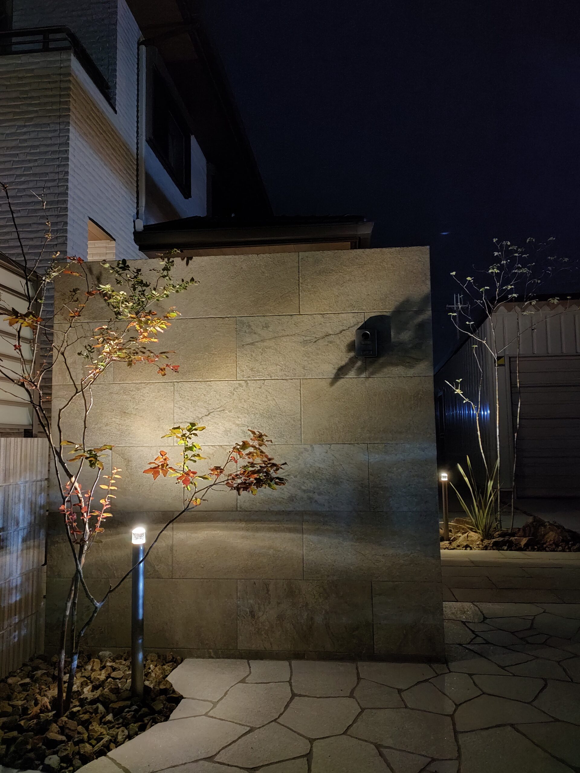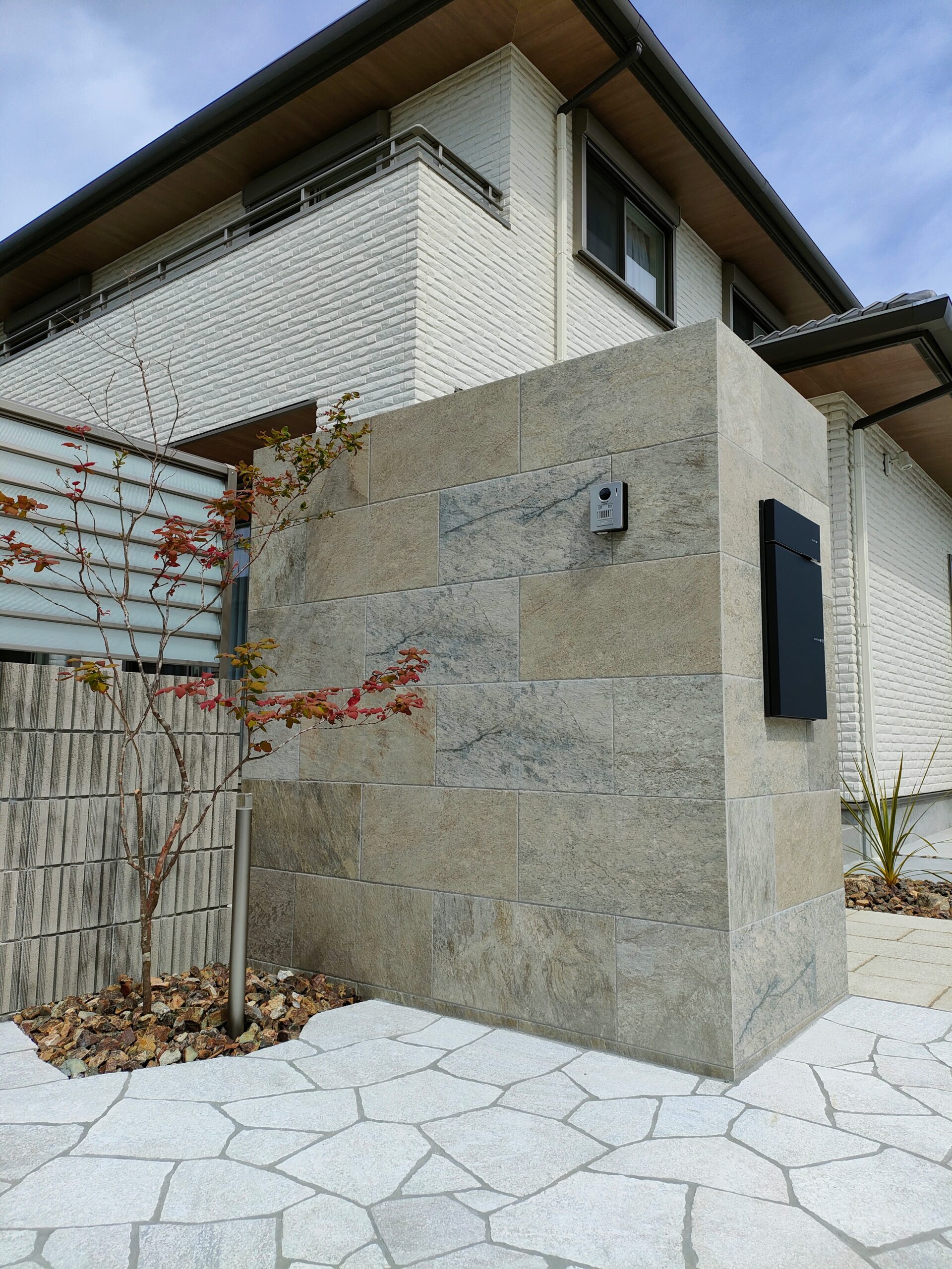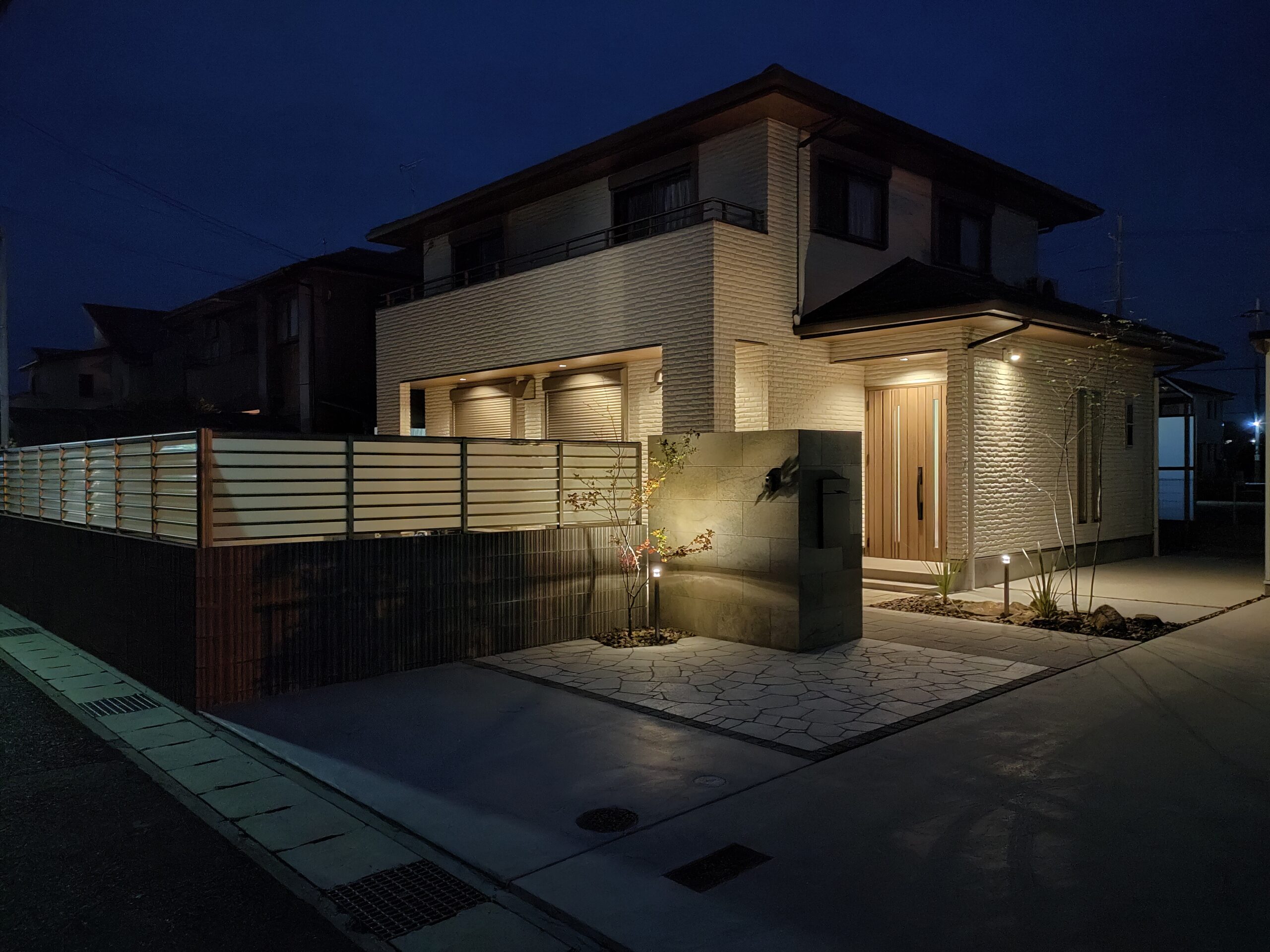 姫路市新築外構 石目調タイル門柱/ライトアップで陰影のある門回り