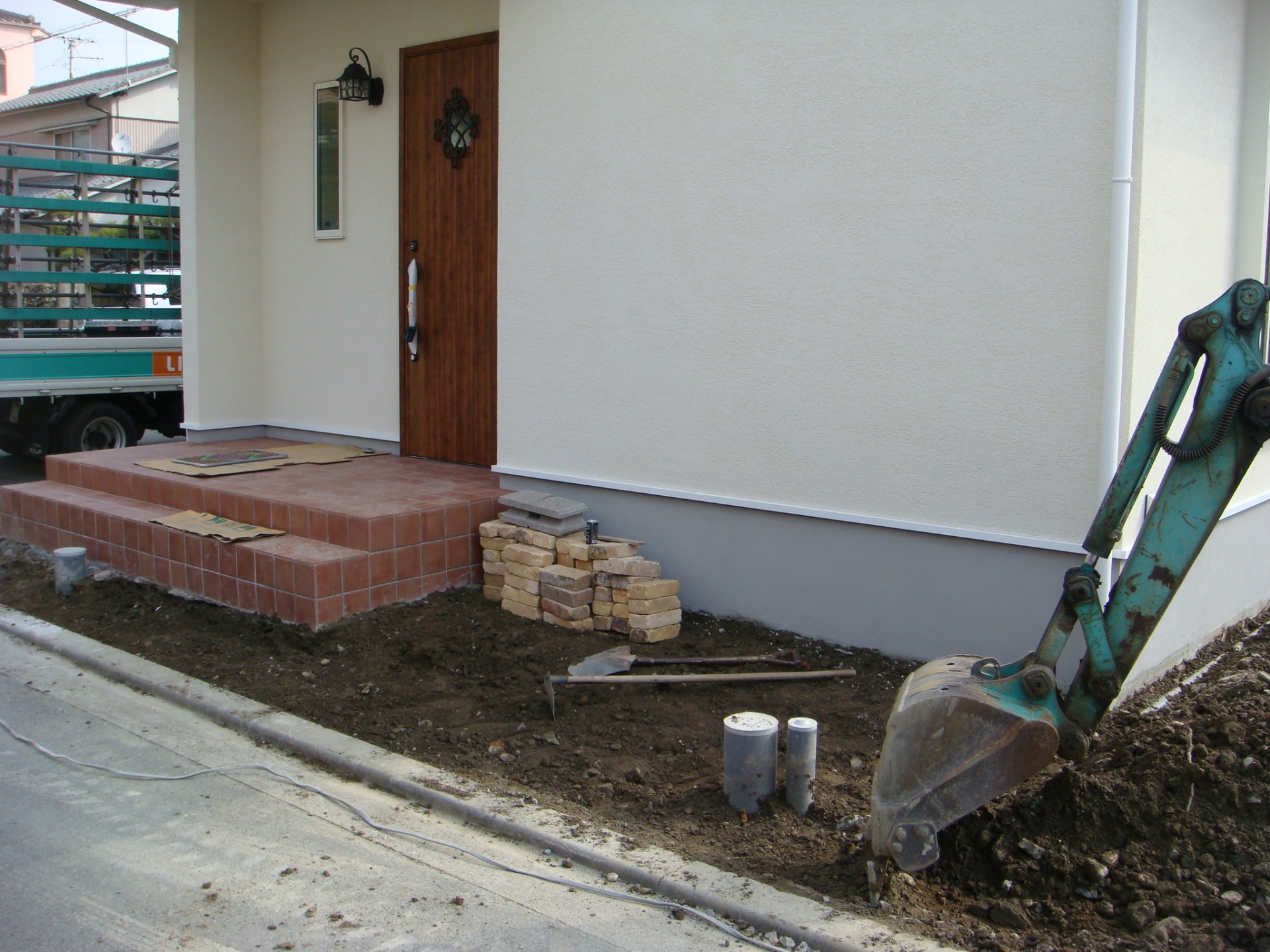 ビフォーアフター ナチュラルなファサードデザイン 姫路市O様邸 玄関前の若干の目隠し要素や白の建物外観に木目調の玄関扉・窓周りのモール、シンプルだけど柔らかい曲線を使用したお庭のイメージをお持ちでした 要所に木目を取り入れ、建物の様な雰囲気に合わせたお庭が出来ました。 レンガや緑を取り入れることで、より一層ナチュラルになりました 植栽の生長が楽しみです 150□のテラコッタタイルの玄関ポーチ 玄関前を素敵に彩ることで家の顔が変わります 目隠しにアイスットプツリーのオリーブを植え、曲線+レンガの門柱が優しい雰囲気を醸し出します 既存の玄関ポーチまで高低差がありますのでステップで解消しないといけません 駐車場からの導線でレンガを敷き詰めたアプローチ 耐火レンガの焼きムラが全体にいい表情になりました