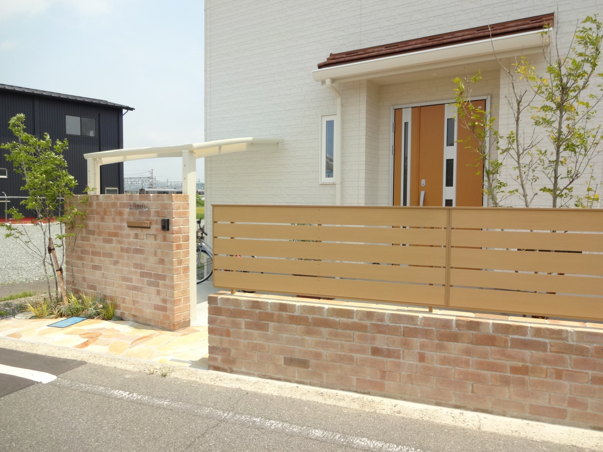 玄関前の塀はレンガ+ディーズガーデン:アルファウッドフェンスで柔らかい印象となっています