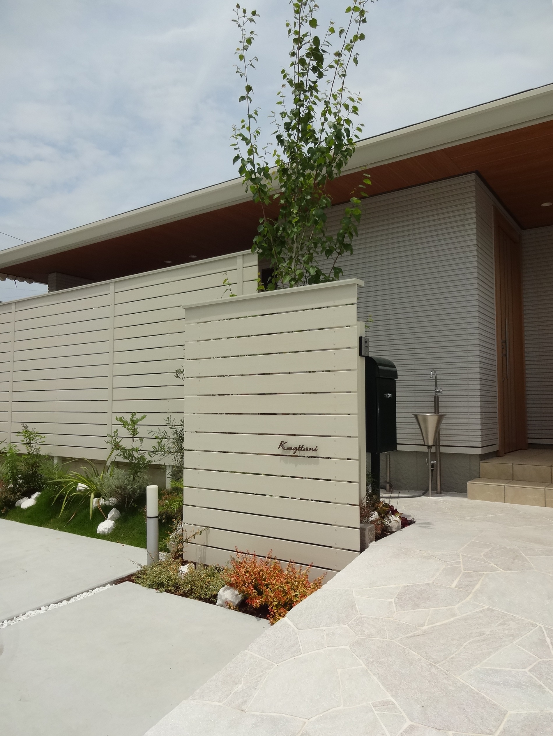 目隠しフェンスや門回り/アプローチなどハードな部分は白に統一しました