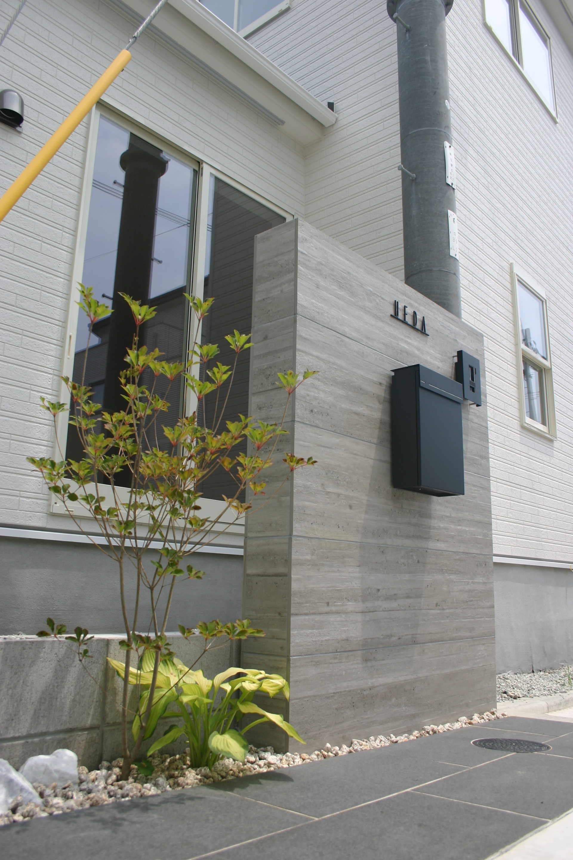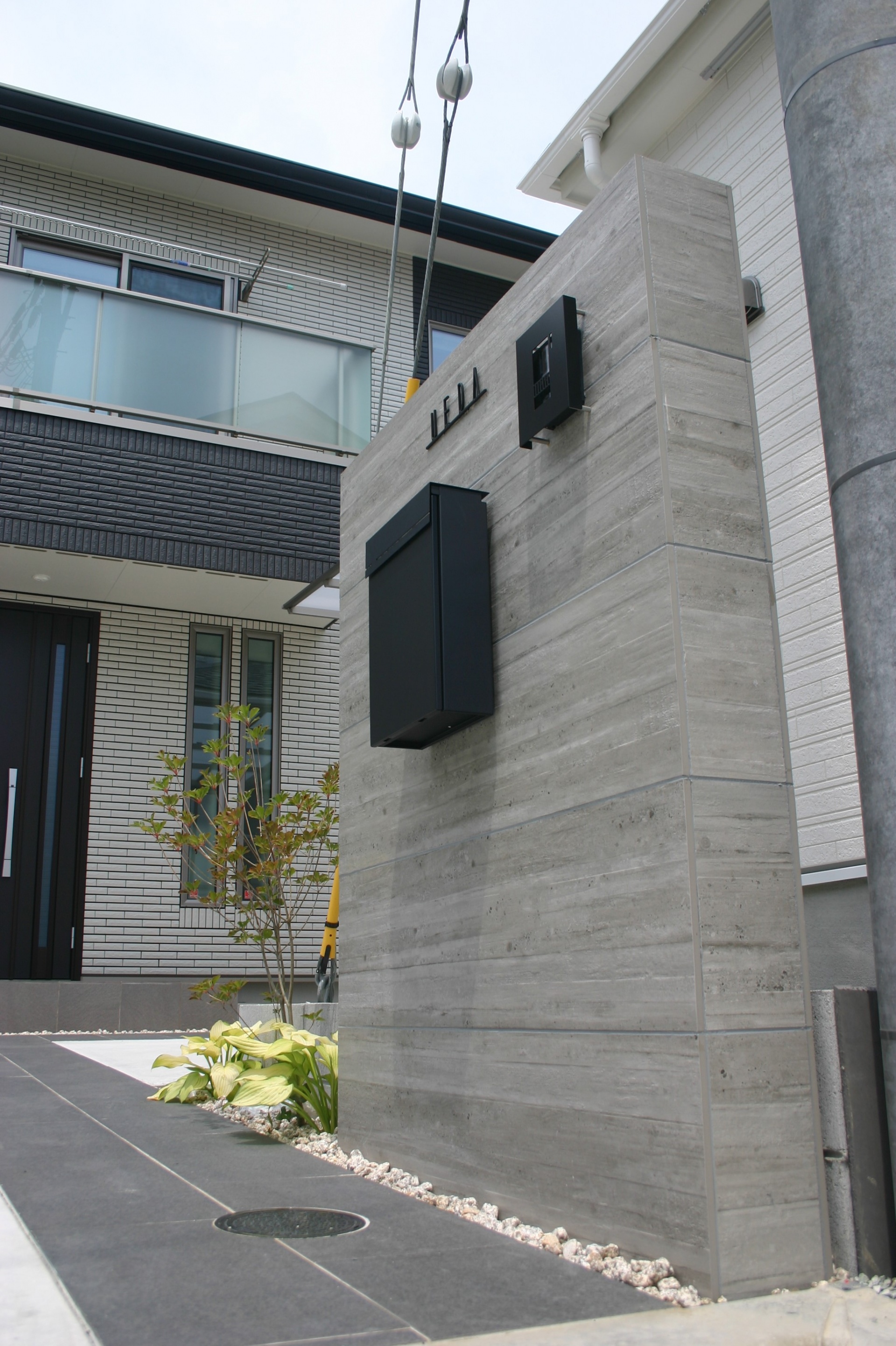 表札などの器具にはブラックマットな質感のもので統一し建物と合ったシンプルなデザインとなっています
