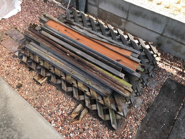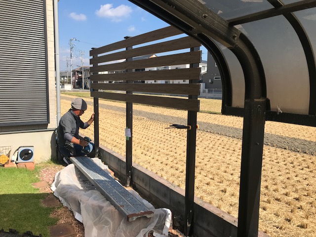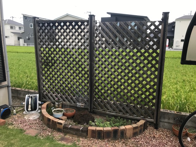 姫路フェンスリフォーム ラチスをアルミ木目調にリフォーム 木製ラチスフェンスのリフォーム 古いラチスを解体して 柱だけを利用して アルミ木彫横板を貼ります 木製フェンスをアルミ横板に張り替えました プチリフォームも姫路・太子のエクステリア屋さん エクステージにお任せください ひがしぐち