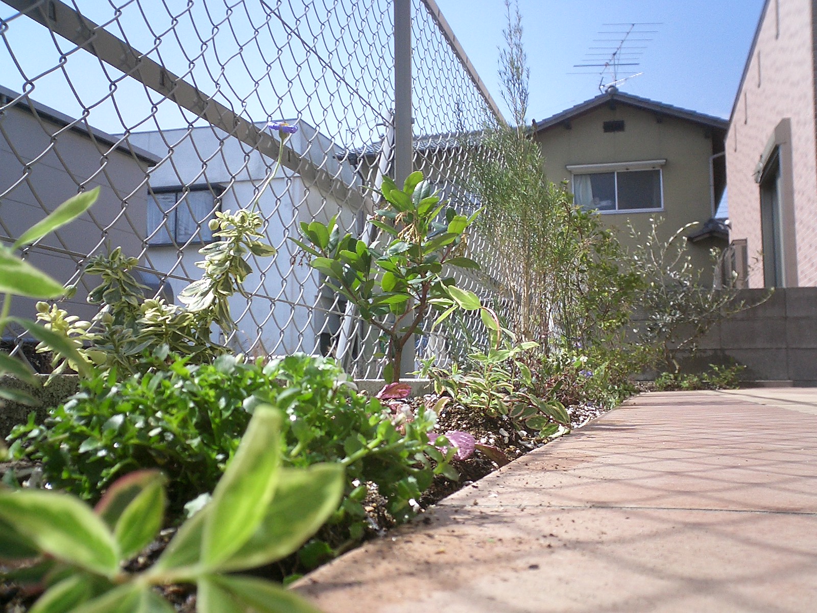 ちょっと分かりにくいのですが、奥にはオリーブ、ユキヤナギ、モッコウバラの白と黄色、トキワマンサク白花、イチゴノキ、ローズマリー、3色ヒペリカムなどなど・・・