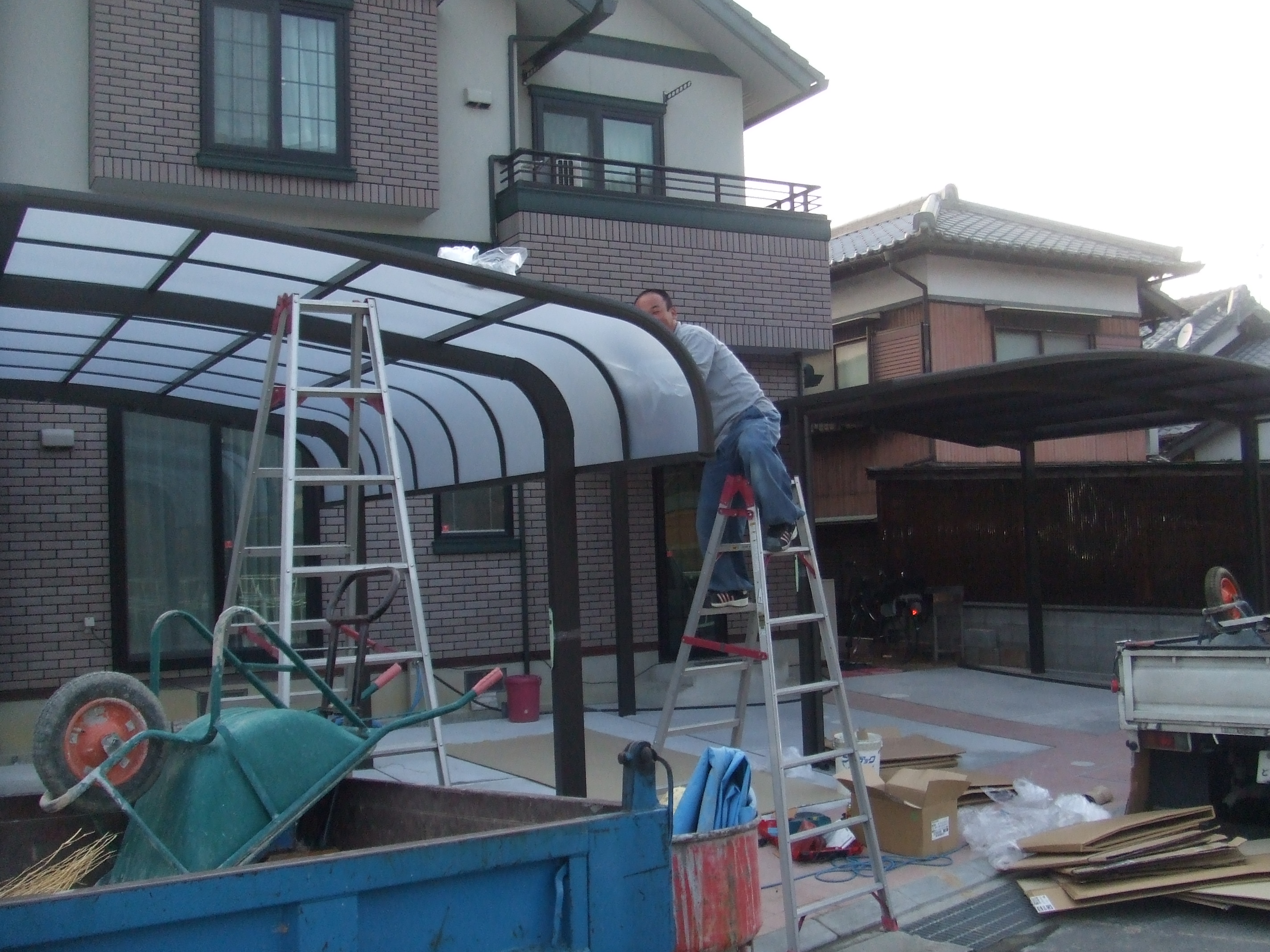 またまた登場 2009年4月12日 またまた登場しました アルミ達人の仕事風景です 先日の ワイドカーポート2台 (4台分)組み立て状況です。2世帯のお宅なので 各1台にカーポート 右のカーポートは 熱線吸収タイプ屋根材。 夏の暑い日に太陽の熱を吸収しますもう片方は 明かるさを確保できる クリアマット。 リビング前などに有効です日々 カーポートの屋根材は進化しています。まだ梅雨は先ですが、今のうちに 愛車のカーポート御検討されてみては如何でしょか。ひがしぐち たかし HPへカエル→