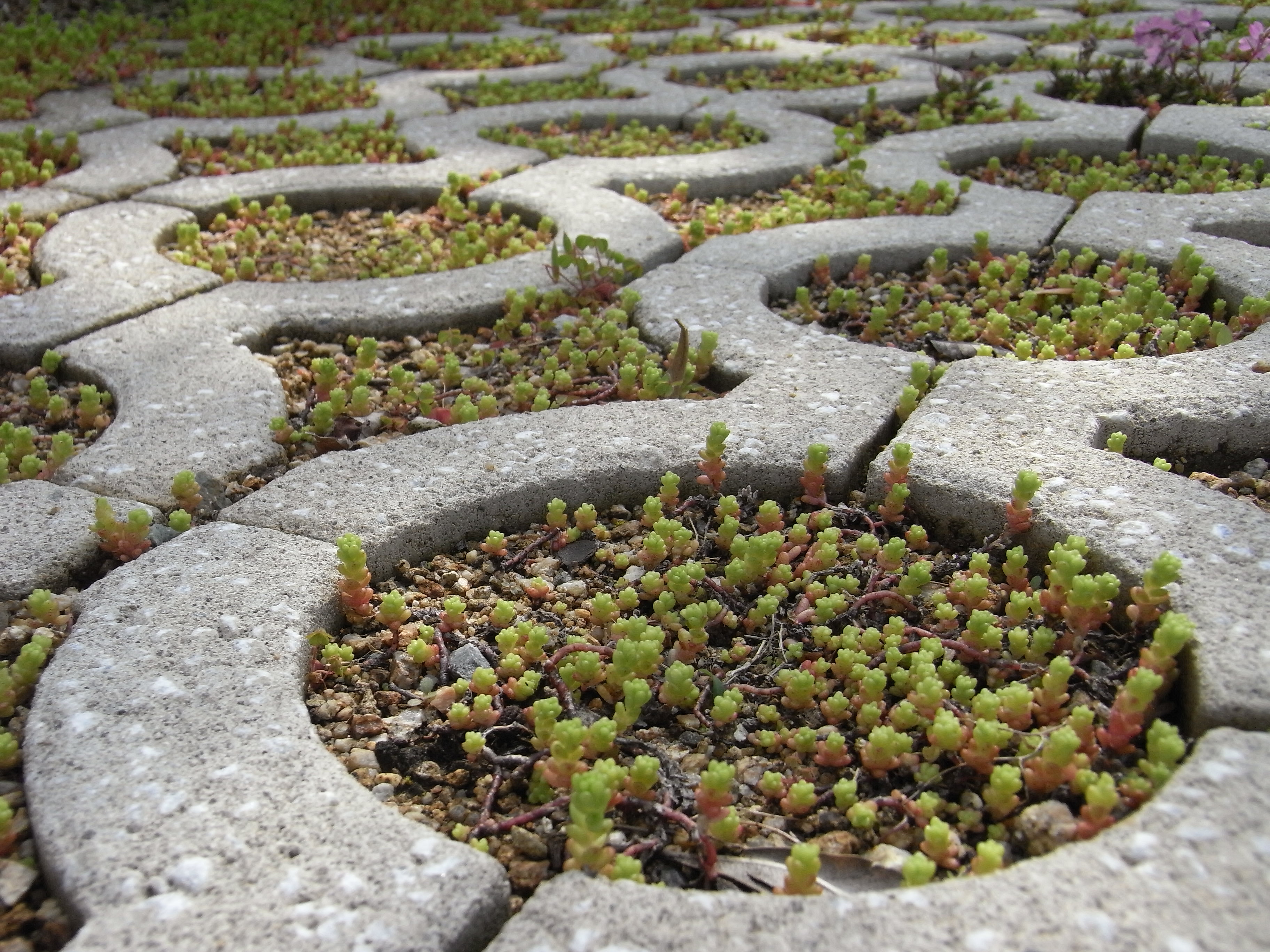 中央の写真は、駐車場をセダムで緑化しています。