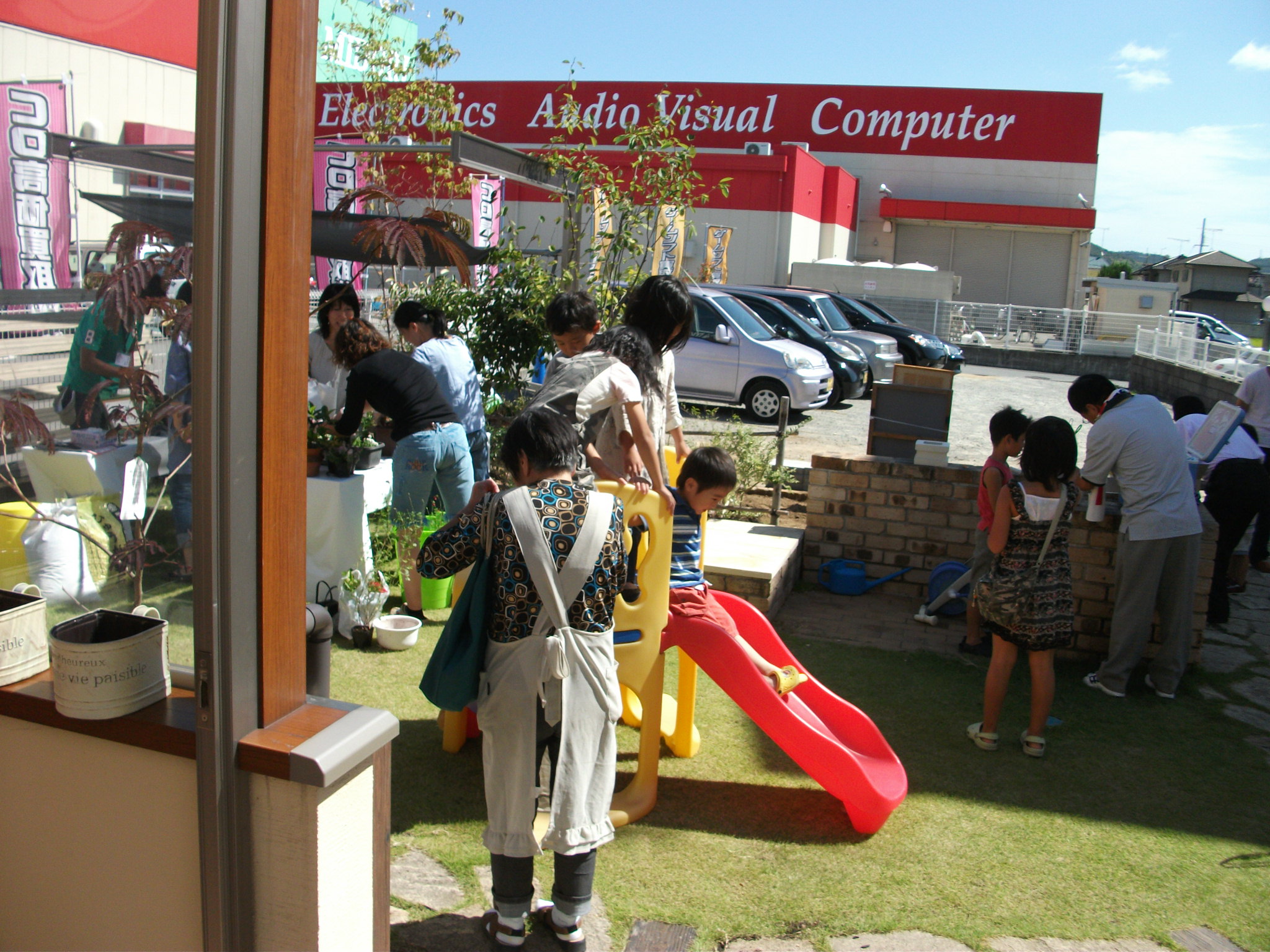 お母さんが鉢植え作業中は、お子様はメダカすくいに夢中です。