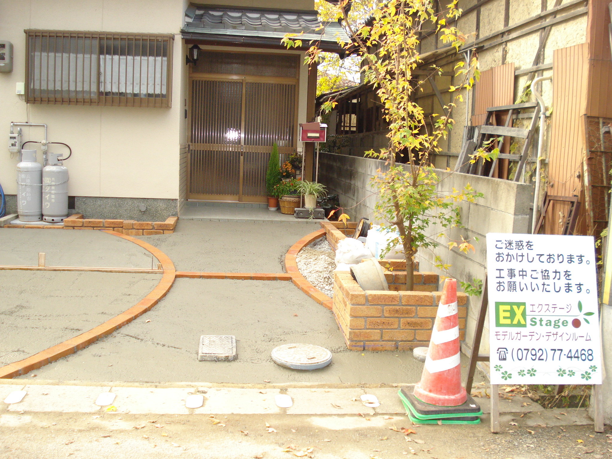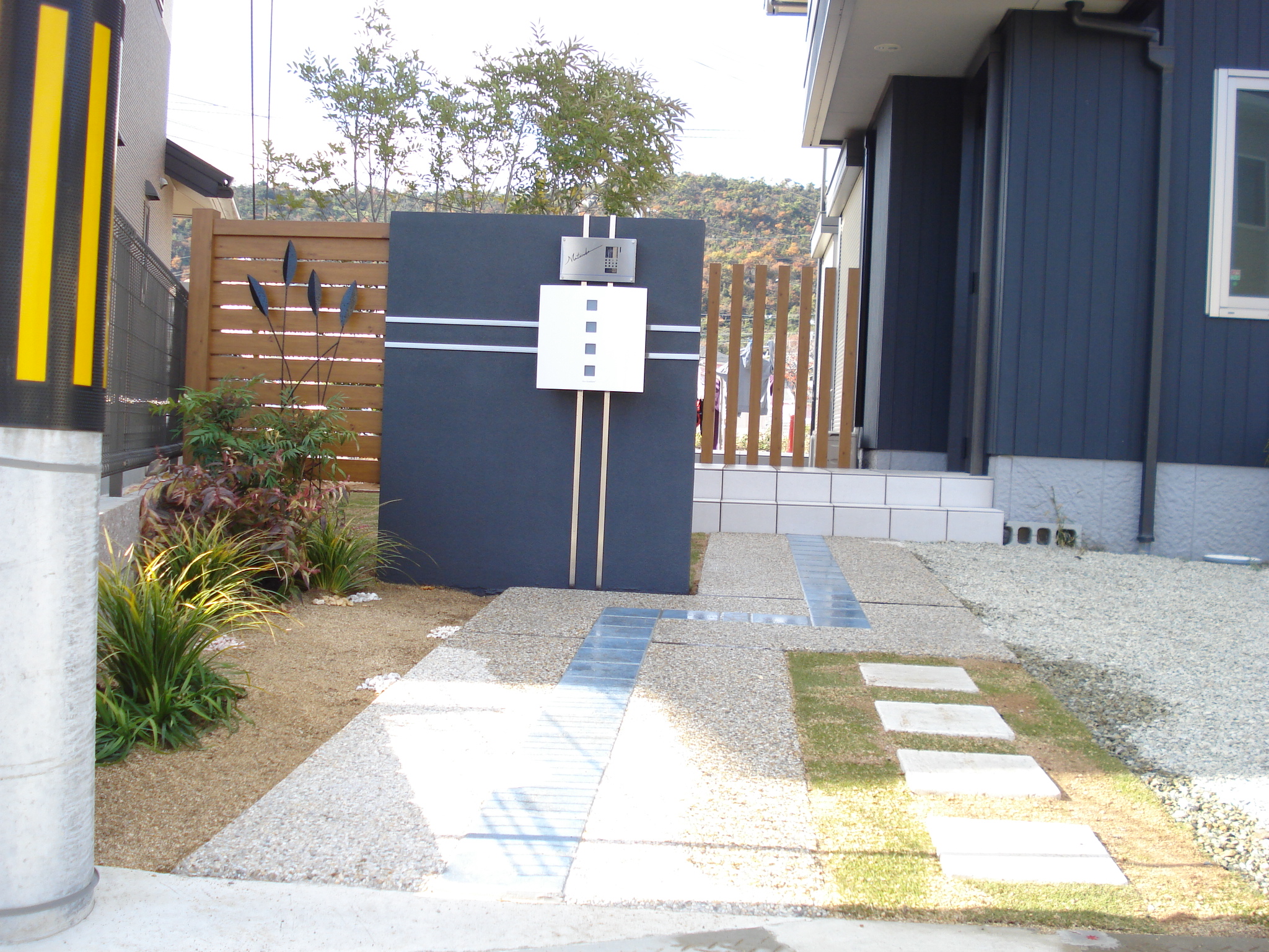 吹き付けも終わり、インターホンカバー付き表札も取り付け、あとは植栽の前に化粧砂利を入れるのみとなりました。
