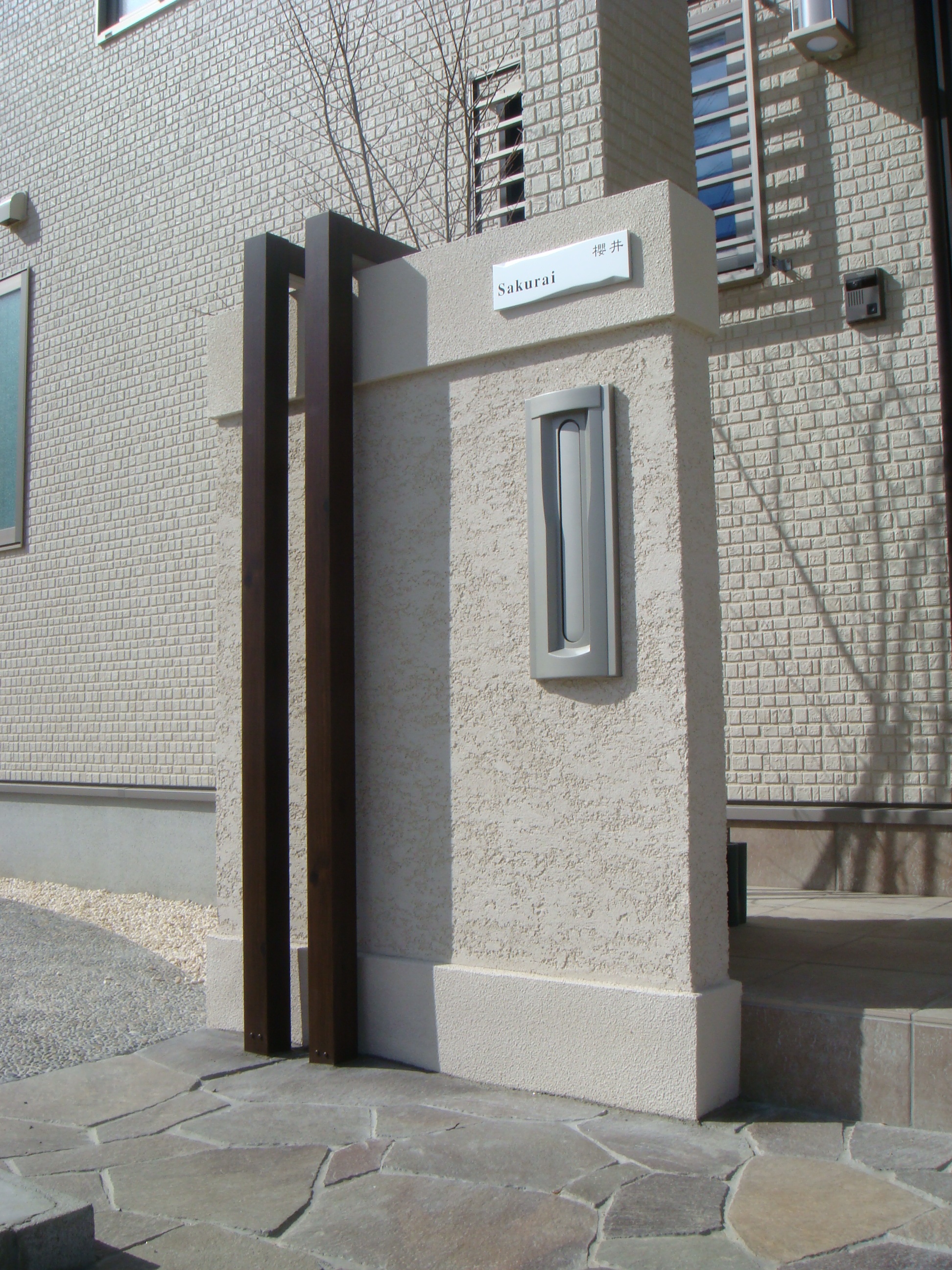 植栽スペースとして緑を確保しました。門柱は玄関前に設け、少ないスペース中でもインパクトのある仕上げにこだわりました。