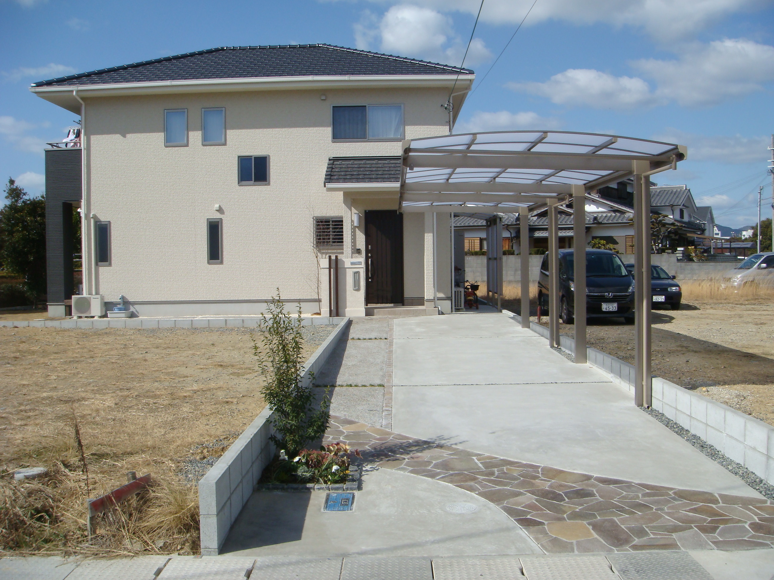 S様邸では専用通路幅が4.0mありますので、車庫スペースとアプローチを