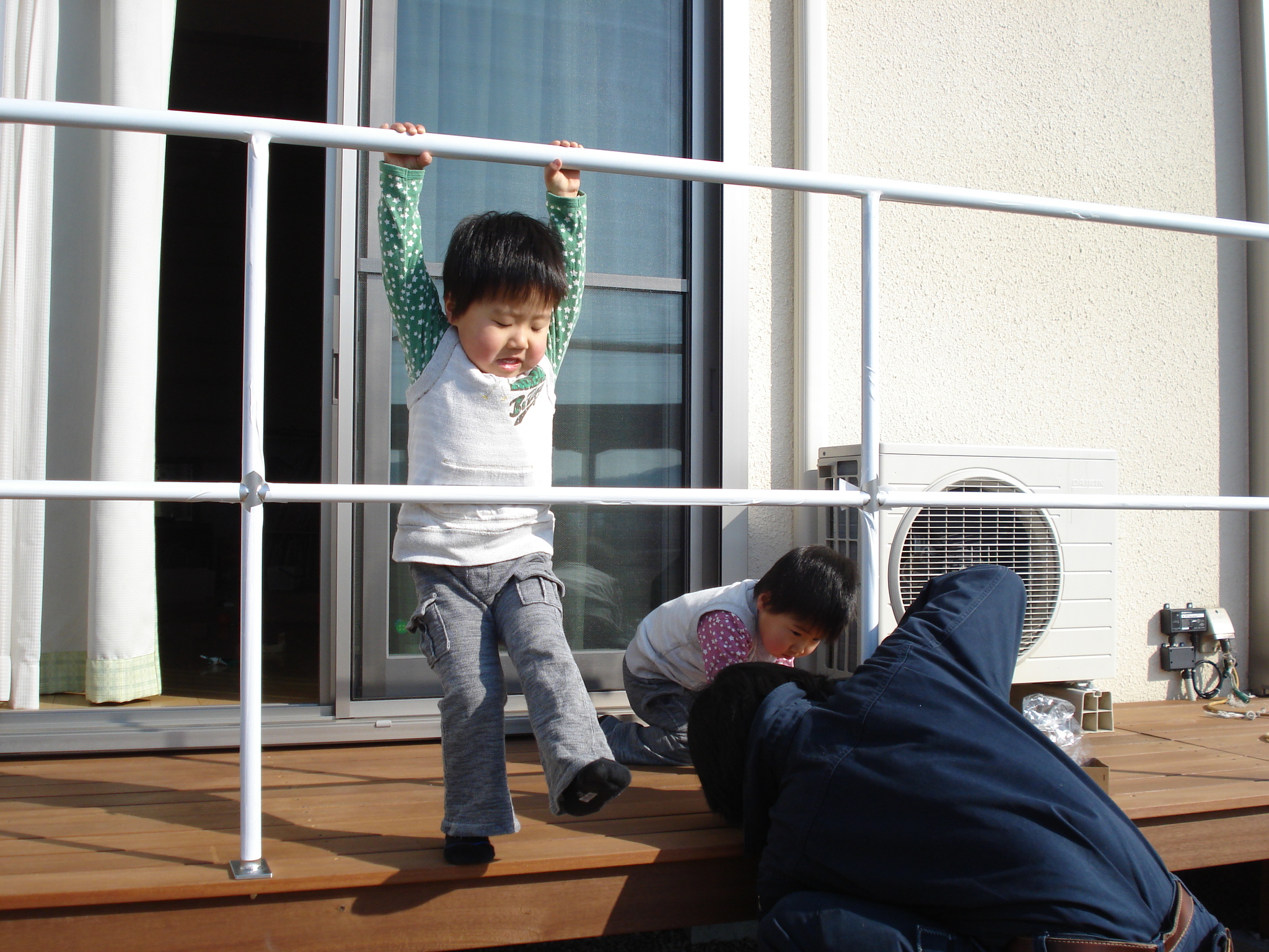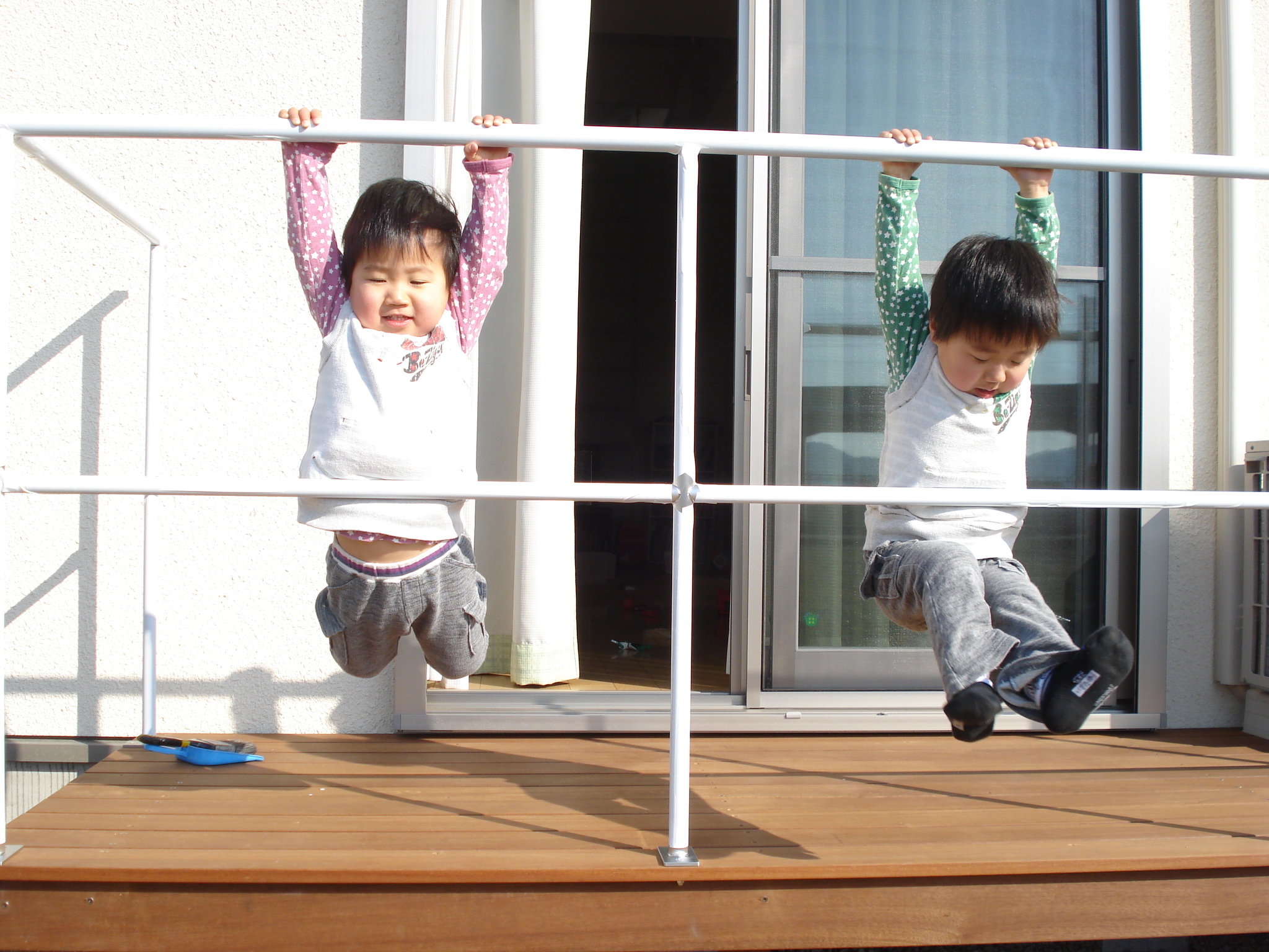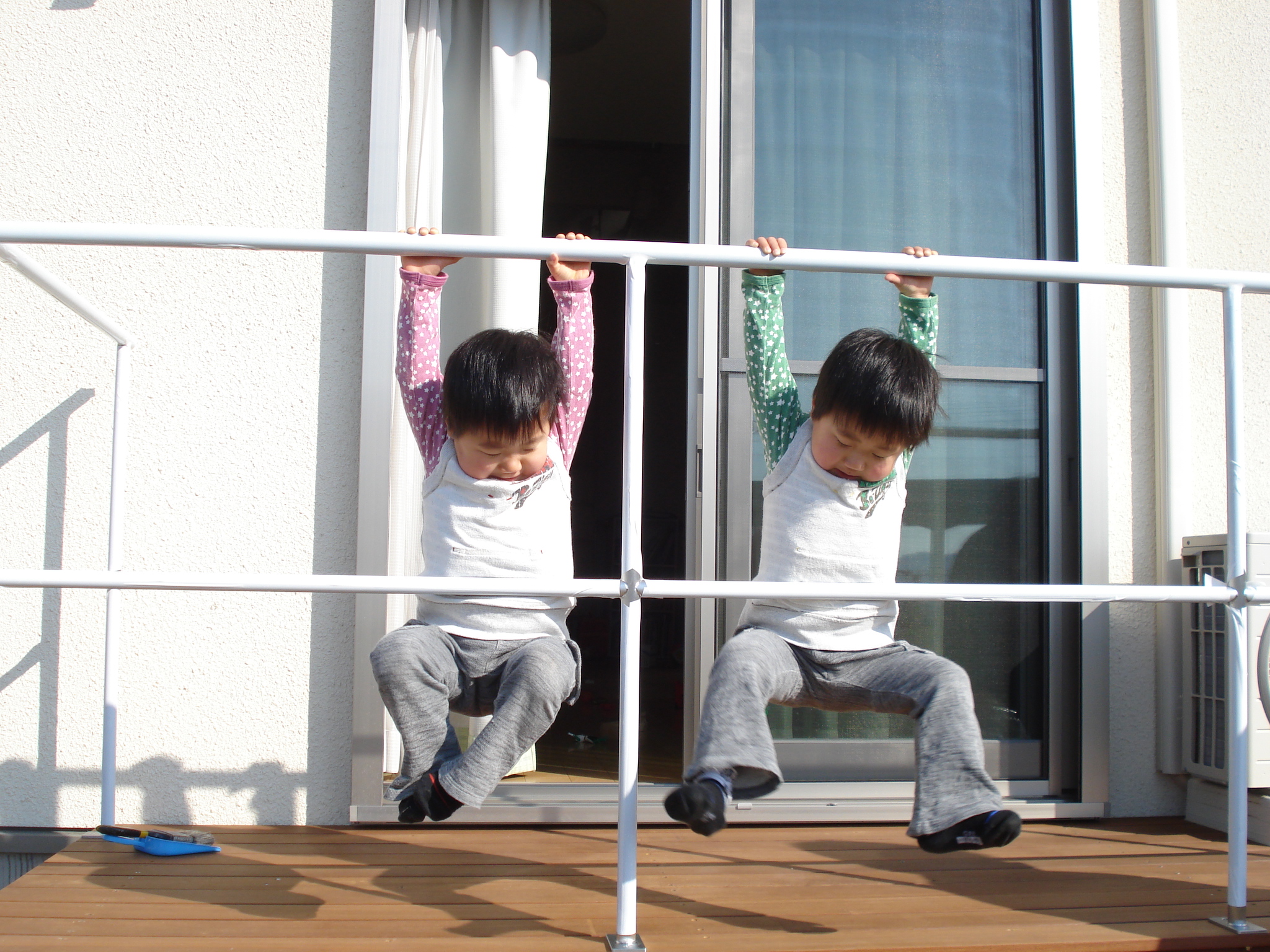 まだ白い養生テープの付いた手すりにぶら下りながら、大はしゃぎの双子ちゃんたち。