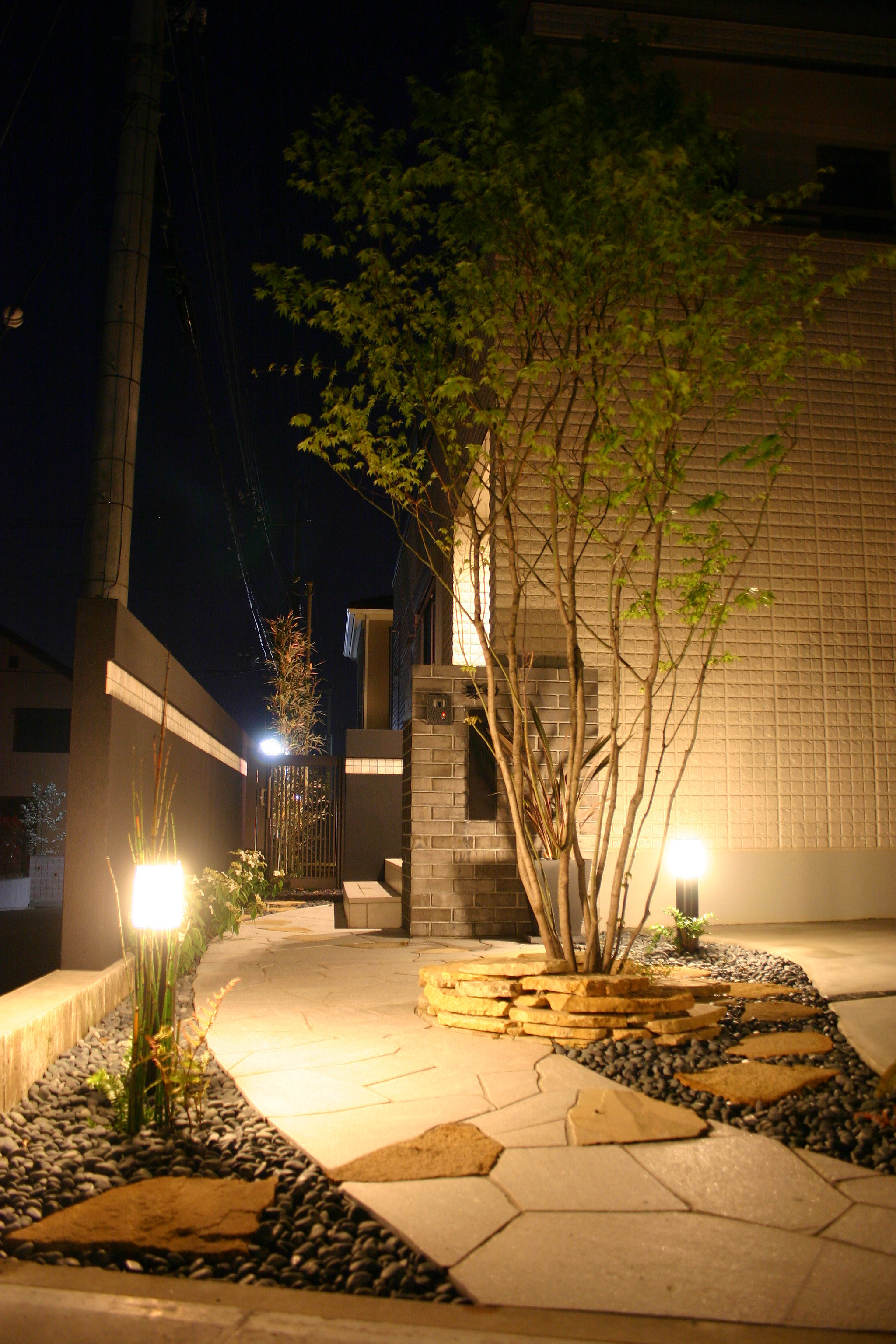その木を中心にプランニングしました。メインアプローチ+遊び心のある飛石アプローチ。