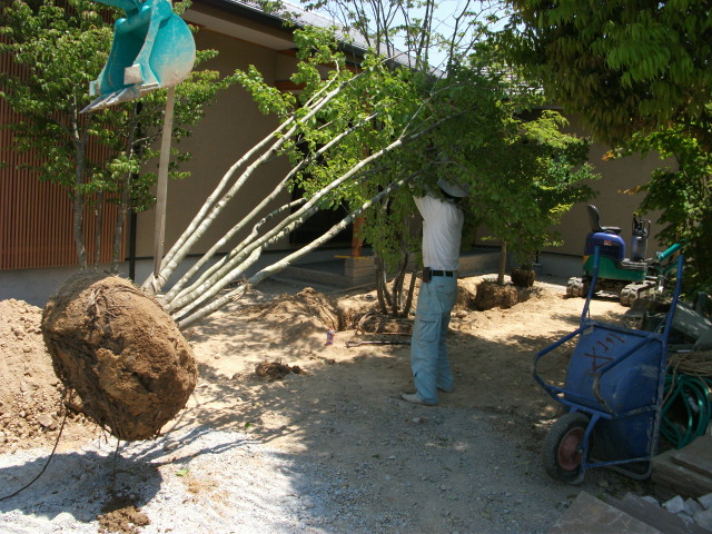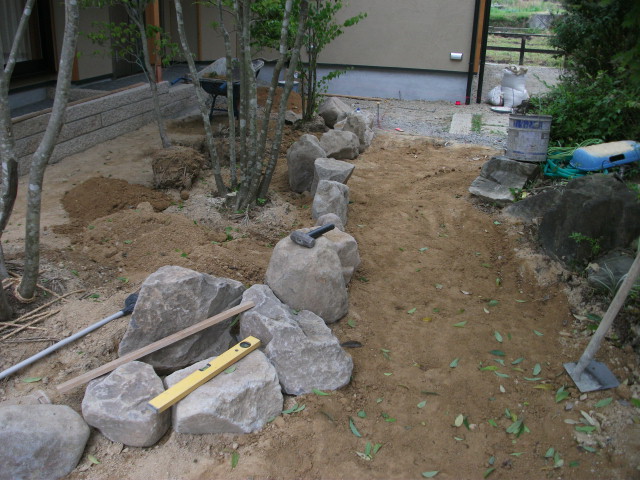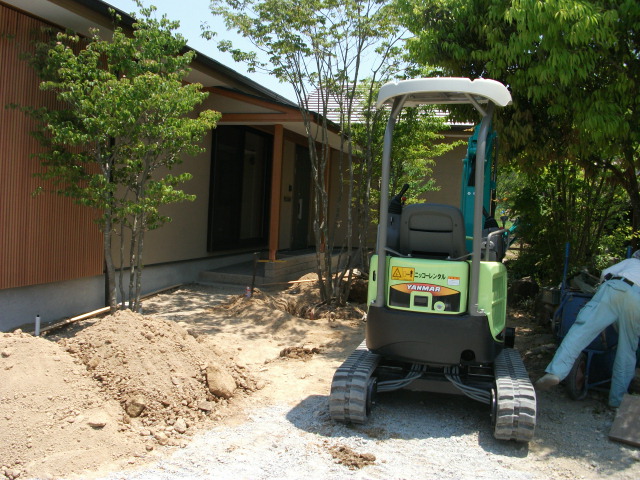 お庭作り進行中 2010年6月13日 今回は10年程前から、お付き合いさせてもらっているお店 丸忠家具さんのお庭の御紹介です。店舗の裏側に平屋のお宅を新築され現在お庭の工事の途中です。写真は着工前植木のほとんどが前からあるものを移植縁取りは小豆島の自然石小道は砂岩石の小道すべて自然志向です今日から梅雨入り 少し工期が延びるのが心配ですが、緑いっぱいのアプローチガーデンに仕上げます。たかし